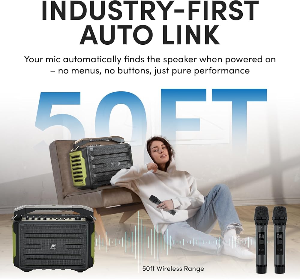 35ft Ultra-Stable Wireless Performance: Portable speaker and microphone set experience seamless 35+ ft wireless performance with auto-pairing mics and studio-grade sound from a 6.5" bass driver and four 3" tweeters, delivering powerful, distortion-free audio for Teachers to move freely in classrooms,Performers to sing without restrictions.