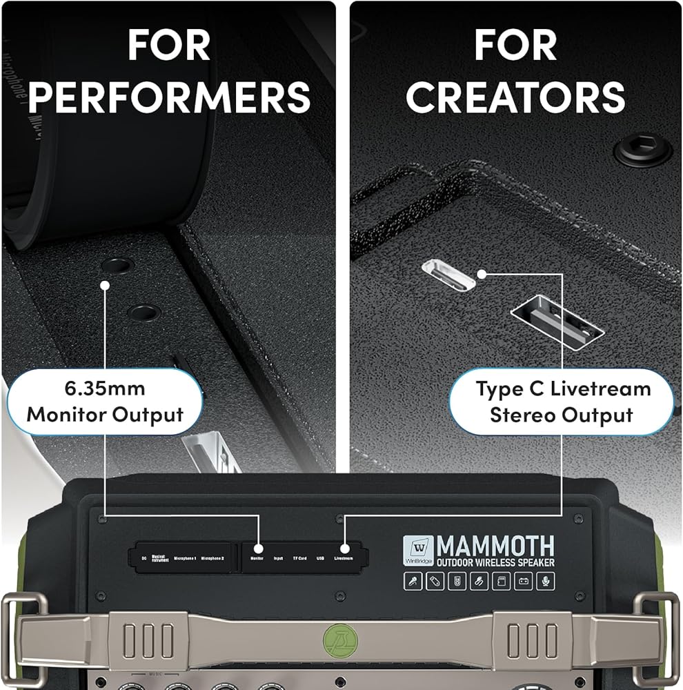 Bluetooth 5.3 Karaoke System: Portable PA system with 6.35mm guitar input, dual mic channels, monitor output, REC function, and livestream connectivity - ideal for buskers and outdoor performances. Supports multi-source playback via Bluetooth/AUX/USB/TF card.