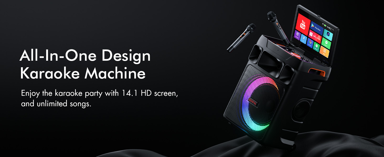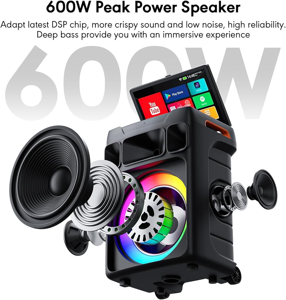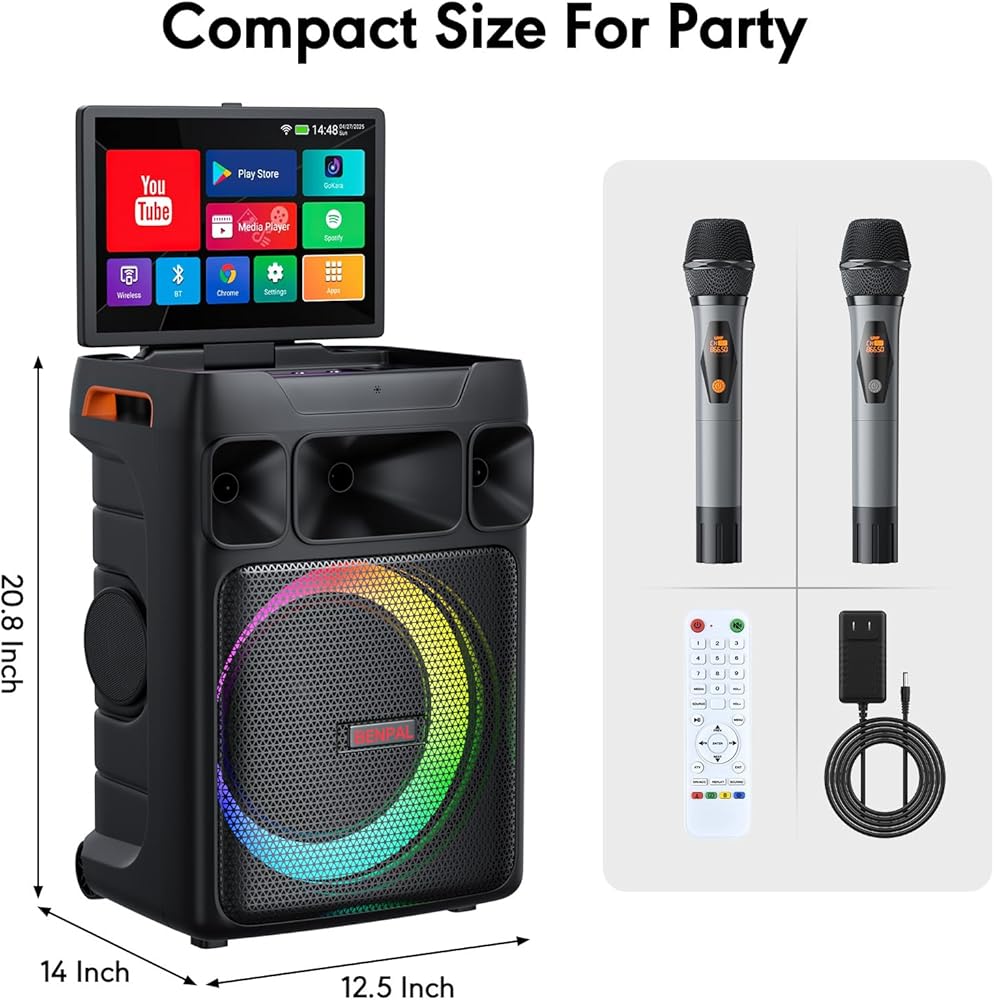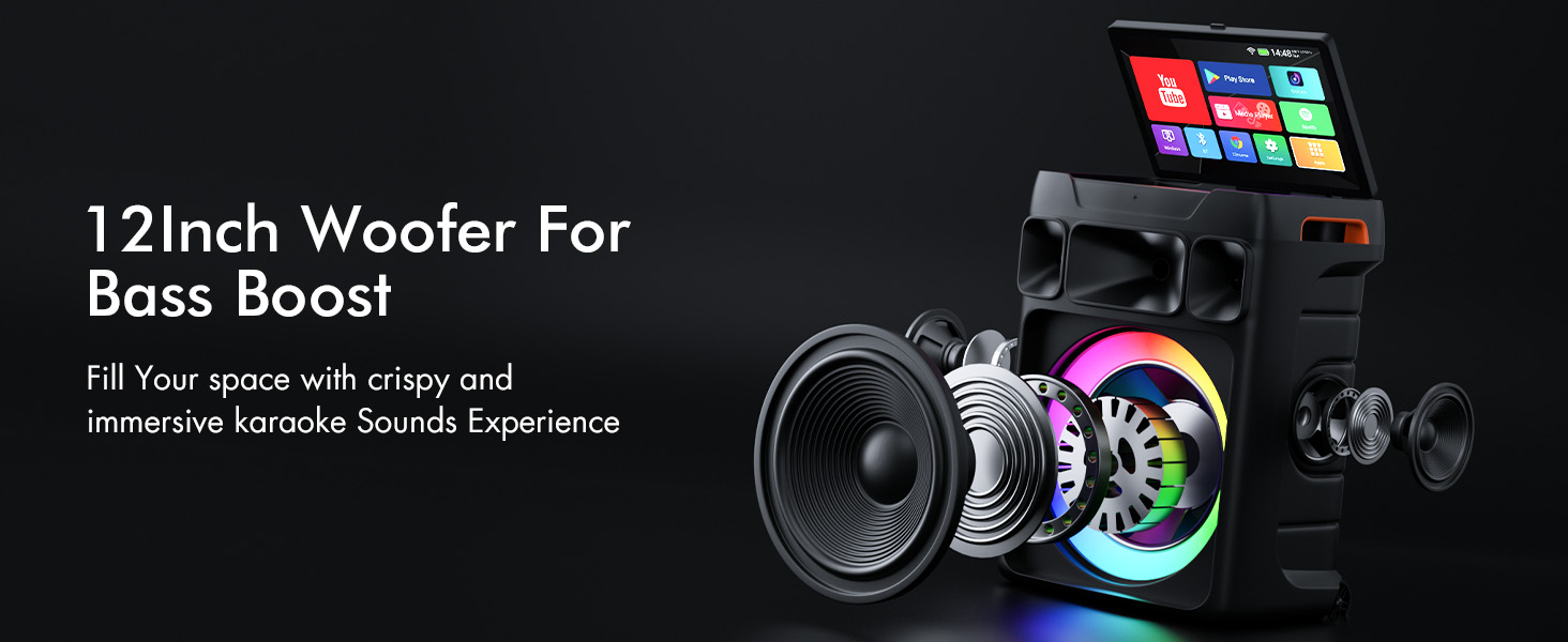 Seamless Performance & Unlimited Music Access : Adopts Android 12, this karaoke system delivers smooth and fast, lag-free operation. Connect effortlessly to phones, TVs, or expand your library via TWS/TF Card/USB/AUX/Live. With PA system support and customizable echo effects, every voice sounds professional
