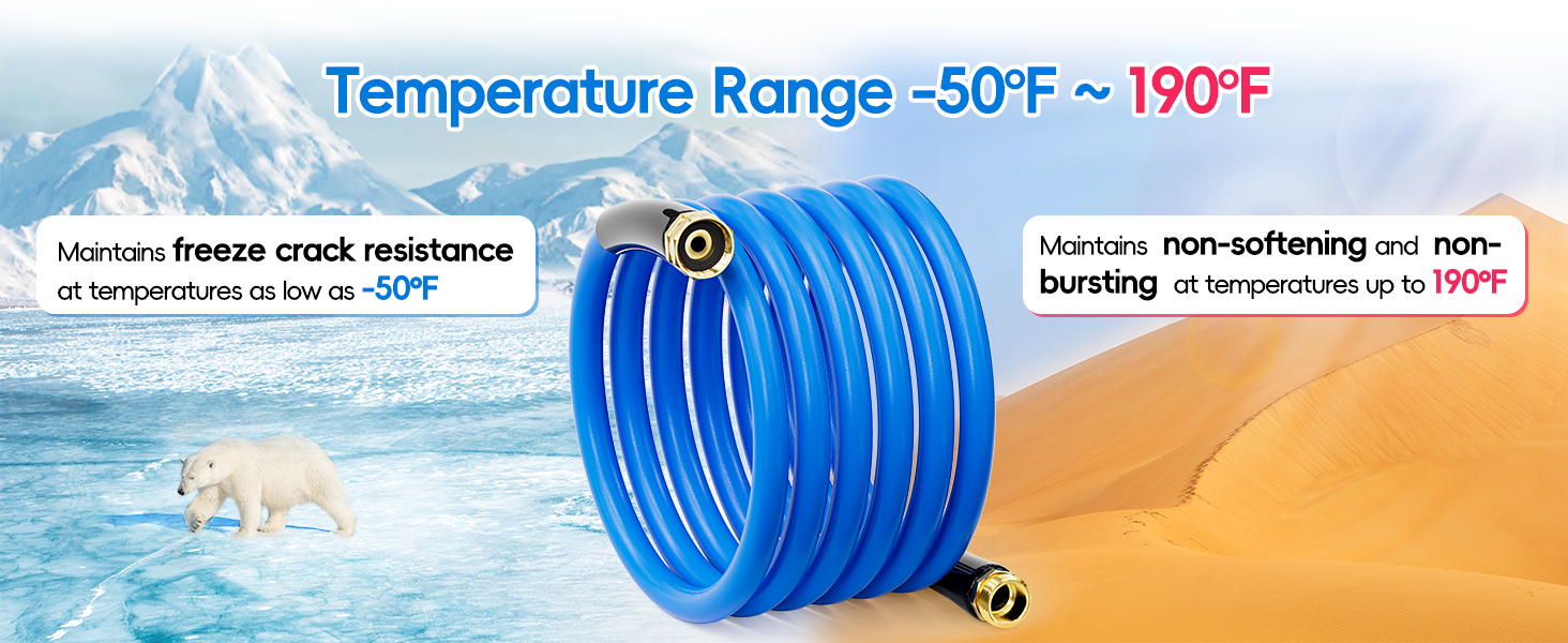 No Cracking Or Hardening At Low Temperatures: The lowest temperature up to -50°F is ahead of its competitors. Waterhose will not crack or harden in extremely cold weather and are always soft.(Recommendation: Drain water from hose in winter when hose is not applied to improve life of hose)