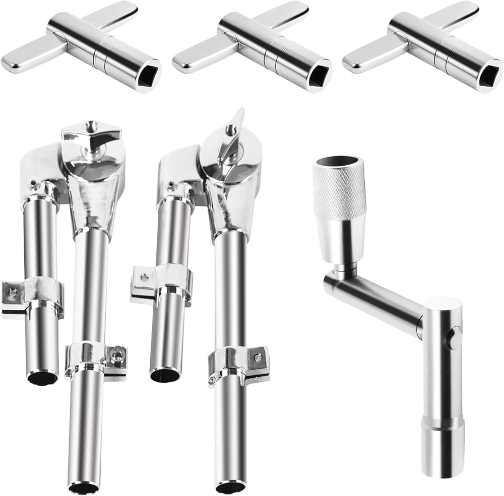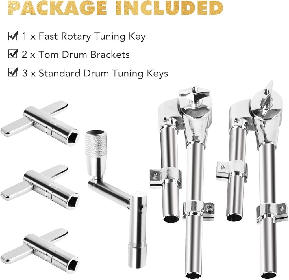 【All-In-One Drum Tool Kit】This complete drum key and tom mount set includes high-strength aluminum alloy 3pcs standard drum keys, 1pcs continuous motion speed drum key and 2pcs heavy-duty tom drum brackets.