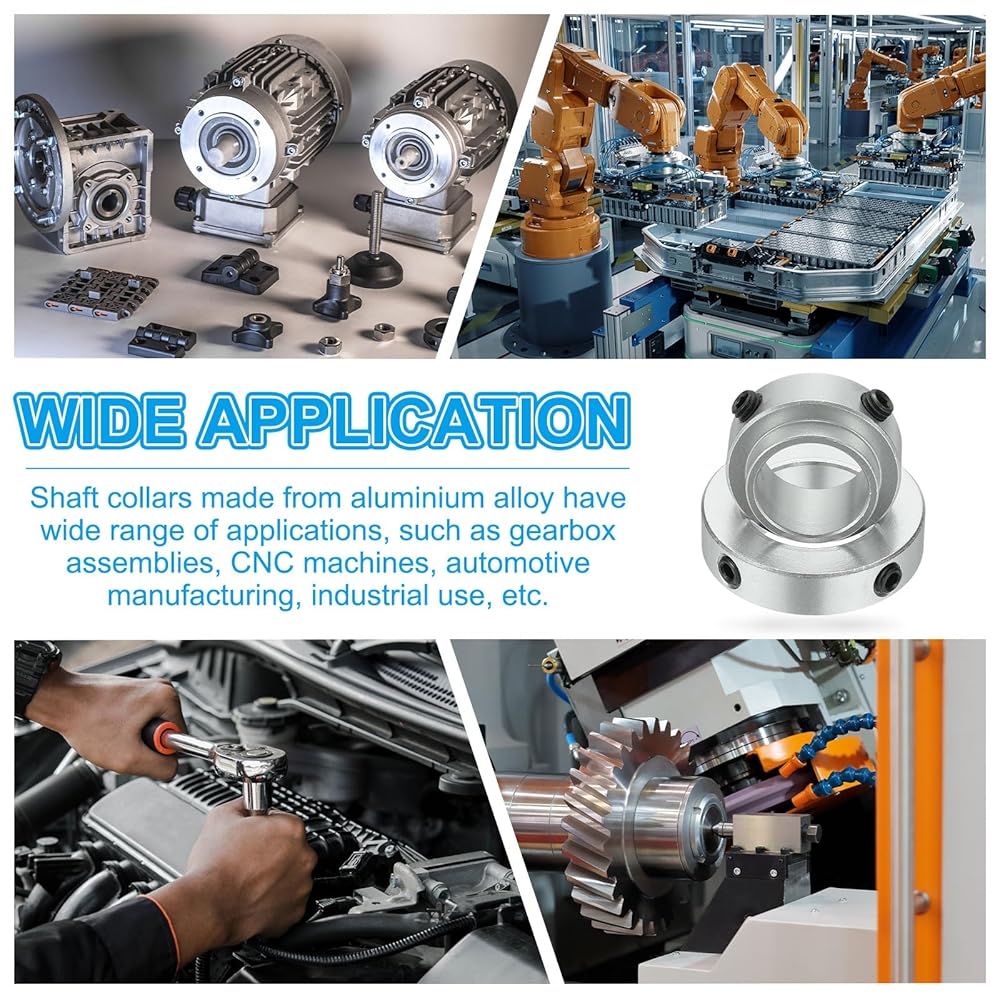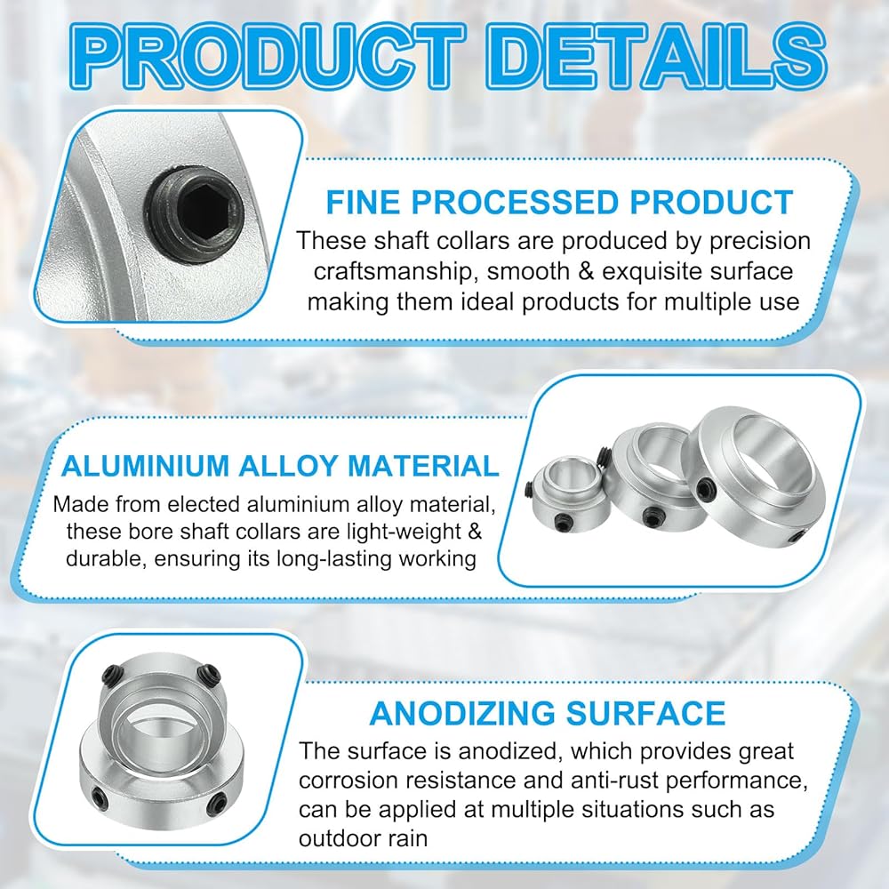 These bore shaft collars are made of aluminium alloy material, which provides outstanding corrosion resistance and high strength, ensuring their long-lasting use, great for various scenes for use. Processed by fine craftsmanship, these shaft collars has excellent metal texture, while the anodizing on the surface provides great anti-rust performance, can be applied at outdoor rain.