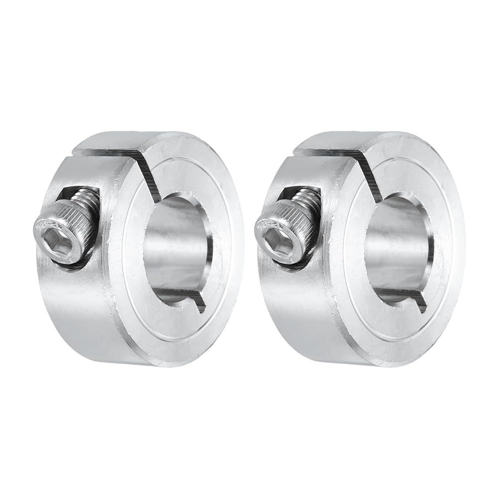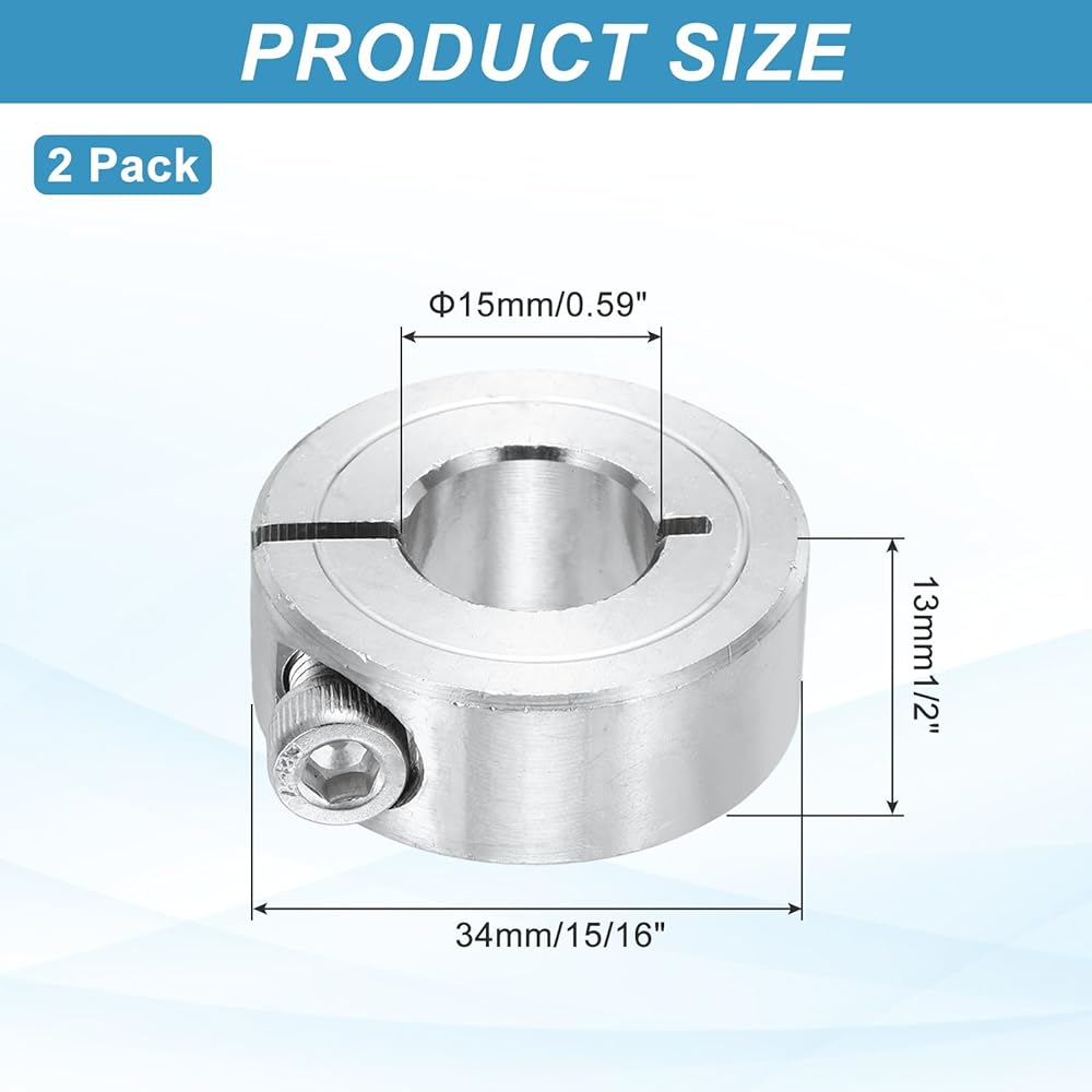 The shaft clamping collars, we provide here, are in the size of: Material: 304 Stainless Steel; Color:Silver; Inner Diameter: 15mm/0.59 Inch; Out Diameter: 34mm/1 5/16 Inch; Thickness: 13mm1/2 Inch;