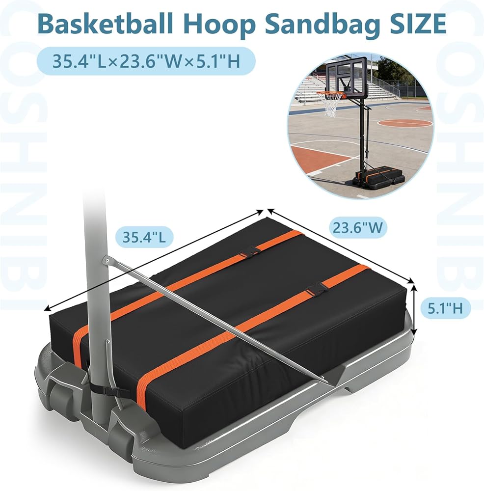 Sandbag Size: The basketball hoop sandbag base measures 35.4"L×23.6"W×5.1"H, compatible with most portable basketball hoop bases. The basketball sandbag is designed to add weight to the hoop base, enhancing stability and reducing the risk of collapse. (Note: The product only the sandbag,not include a basketball hoop, plastic base, or sand.)