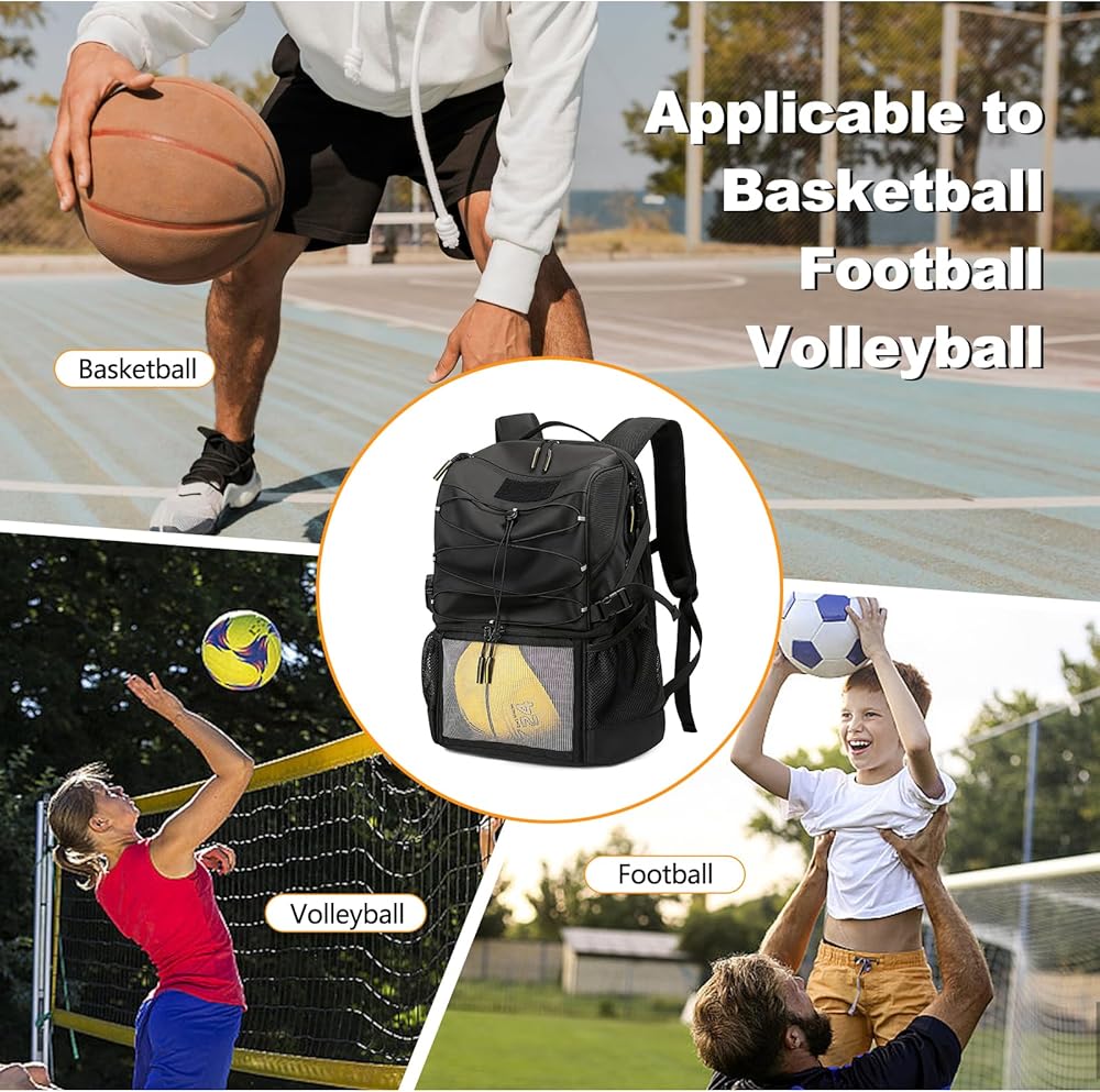 [Separate Compartment]: Tangcorle basketball sports backpack with dimensions of 13" x 9" x 17.7" and 34L capacity. This basketball training equipment bag has a separate basketball compartment for football, basketball, volleyball or rugby, a separate shoes compartment with ventilation holes that can accommodate US men's size 10 shoes, and a large compartment for laptops, clothes and other sundries. This is a professional sports backpack for sports enthusiasts.