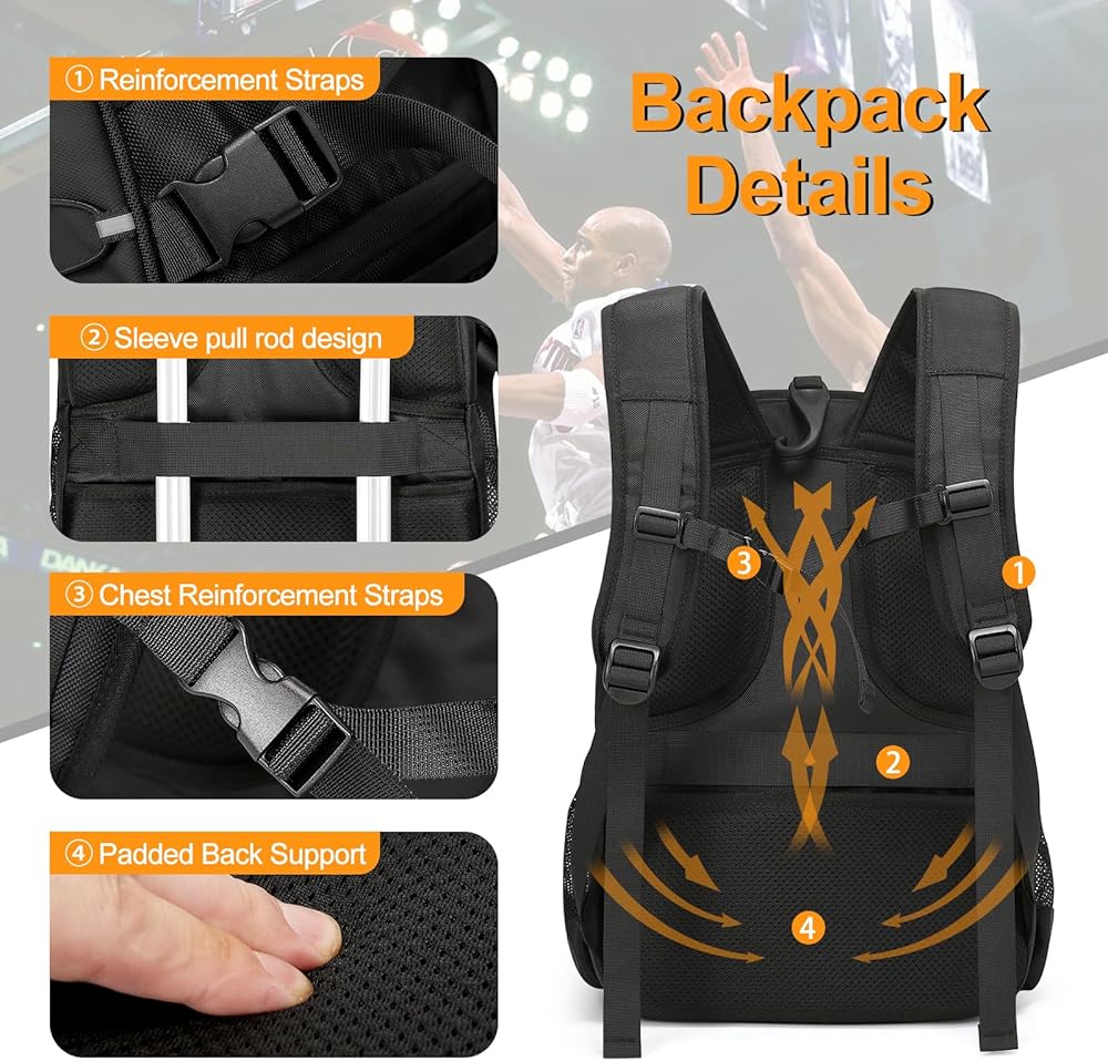 [Safety Reflective Design]: The football backpack has reflective strips on the front for added safety in dark environments. The charging port design makes it convenient to place a power bank in the bag to charge your phone. Reinforced straps have been added to the sides and shoulder straps to balance the weight of your basketball gear, making it easier to carry and keeping your items more stable.