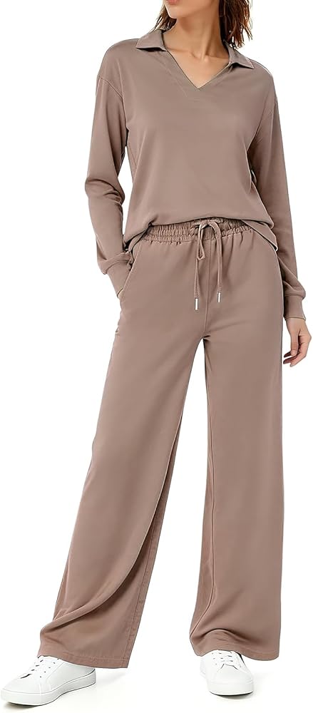 Chic Two-Piece Design: This elegant two piece lounge set for women features a long-sleeve V-neck pullover and high-waisted wide-leg sweatpants. The flattering, loose-fit design creates a sleek, flowing silhouette, making it a fashionable and functional jogging sets for women option