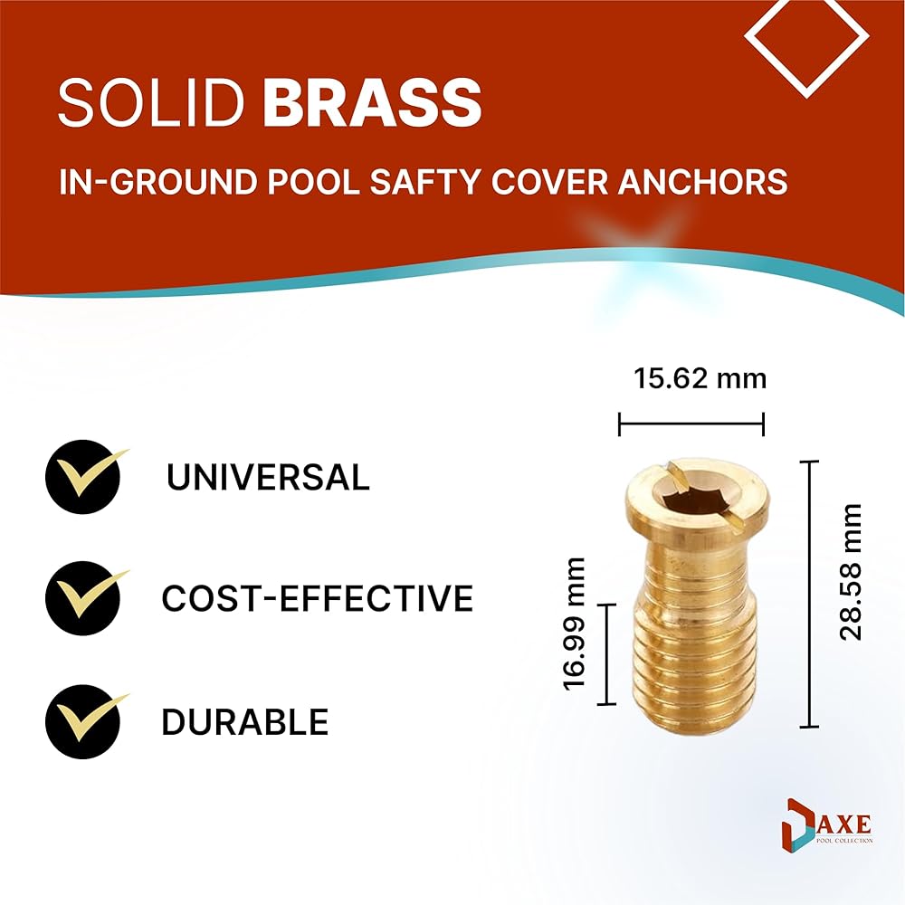✅【HIGH QUALITY】Our brass pool cover anchors bolts are made from high-quality brass metal. These pool cover underwent rigorous testing to ensure durability, especially in harsh cold weather. They were also perfectly engineered and will work as replacement parts for most major brands. Each will fit to the anchors installed concrete deck.
