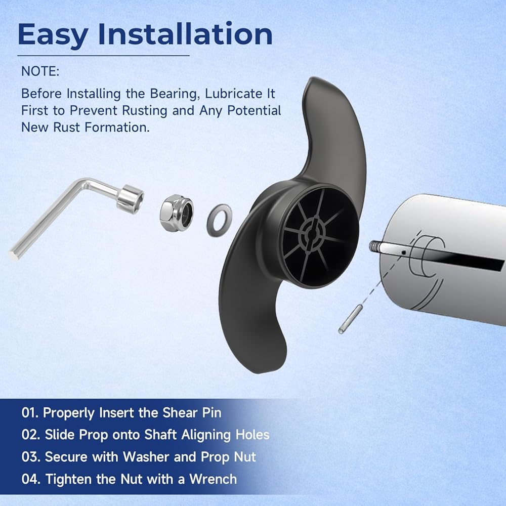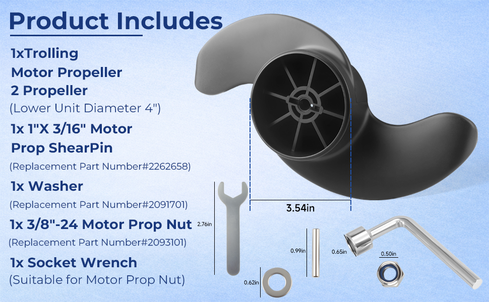 【Product Includes】: 1×Trolling Motor Propeller, 1×one large shear pin (1” x 3/16” ),1×washers,1×(3/8"-24 support nuts),1×socket wrench (for motor propeller nut),1×Small open-end wrench
