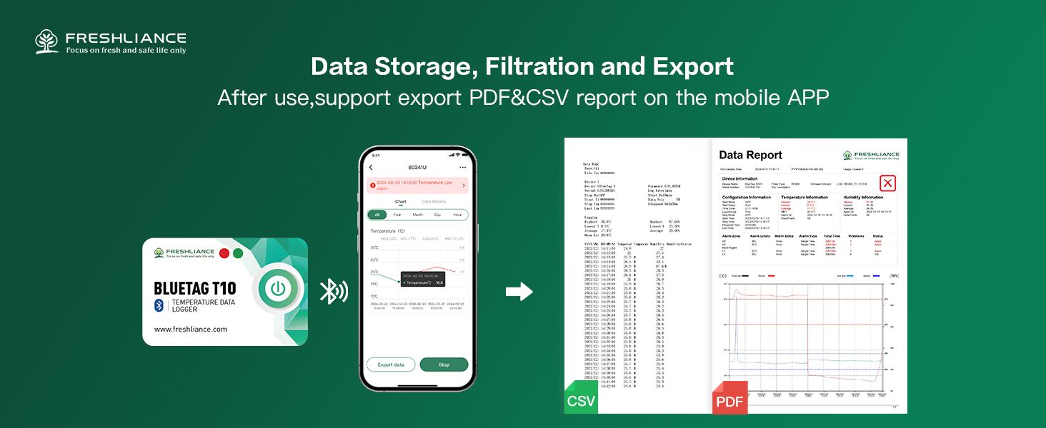 Report Export: Free 2-year cloud storage for data. Support exporting temporary reports and PDF/CSV reports. PDF/CSV reports can be shared or forwarded by email. A signature is available for the PDF report generated after stopping the device.