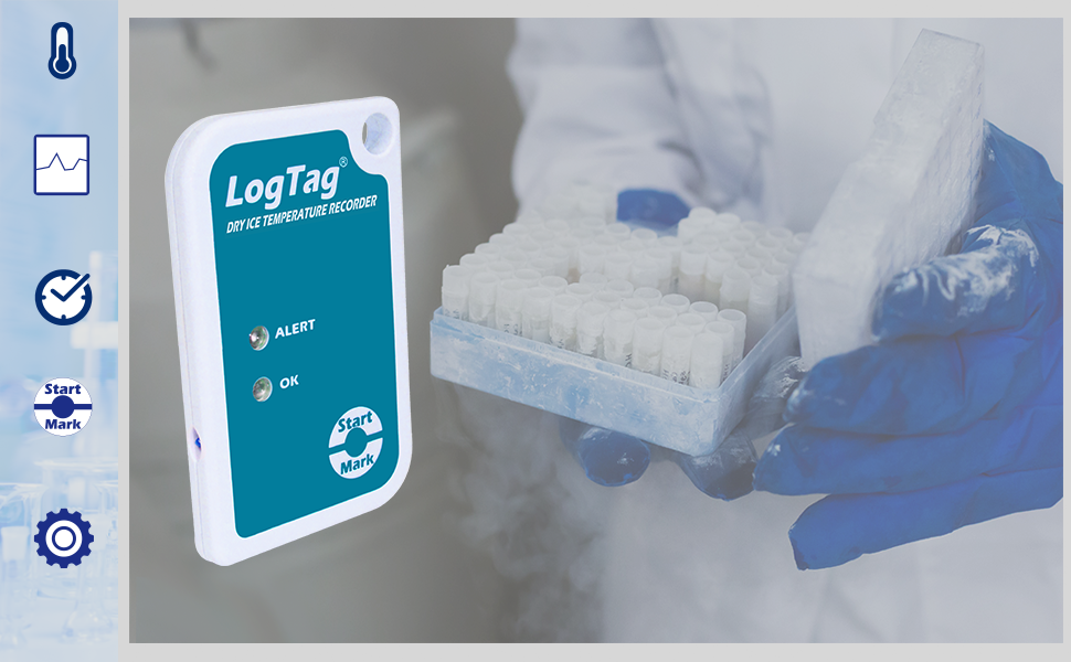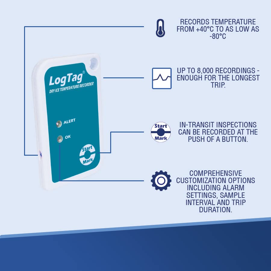 The LogTag Dry Ice “Probe-less” multi-use low-temperature recorder operates, measures and stores up to 8,000 real-time temperature readings in temperature environments ranging from -80 °C to +40 °C (-112 °F to +104 °F).