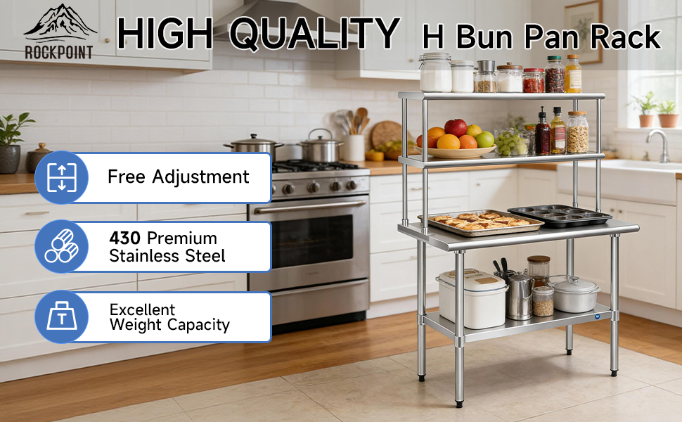 Durable Material: Our stainless steel overshelf features 18-gauge type 430 stainless steel construction with a polished surface, ensuring excellent rust and corrosion resistance.Besides,it can be quickly cleaned with a rag or paper towel.