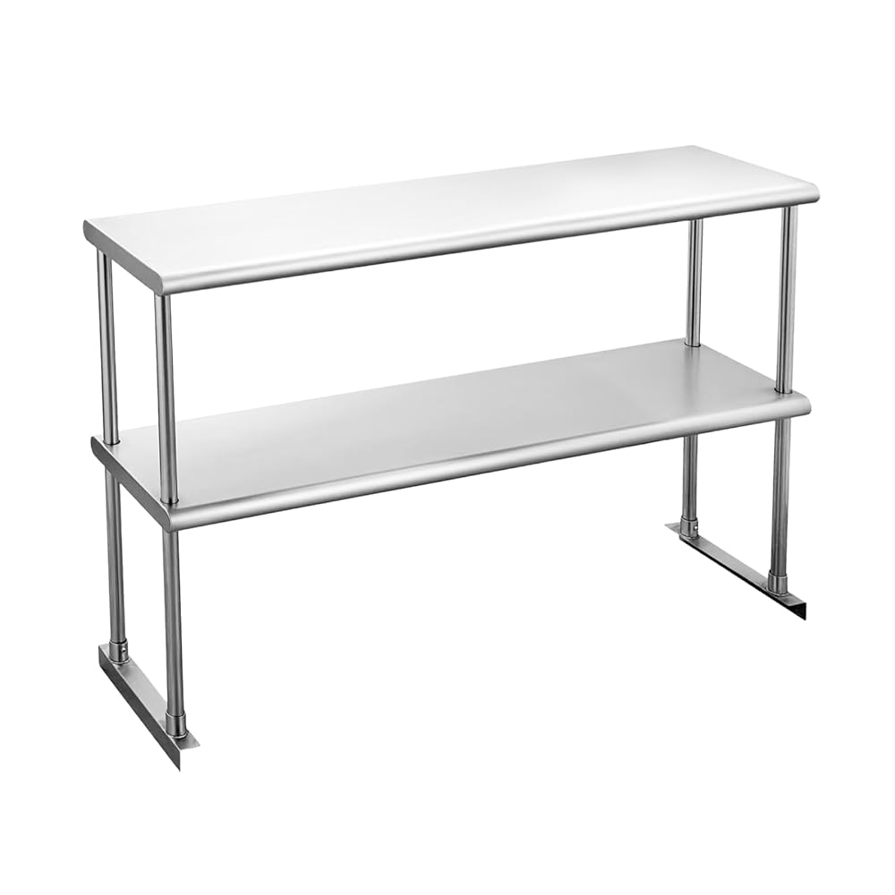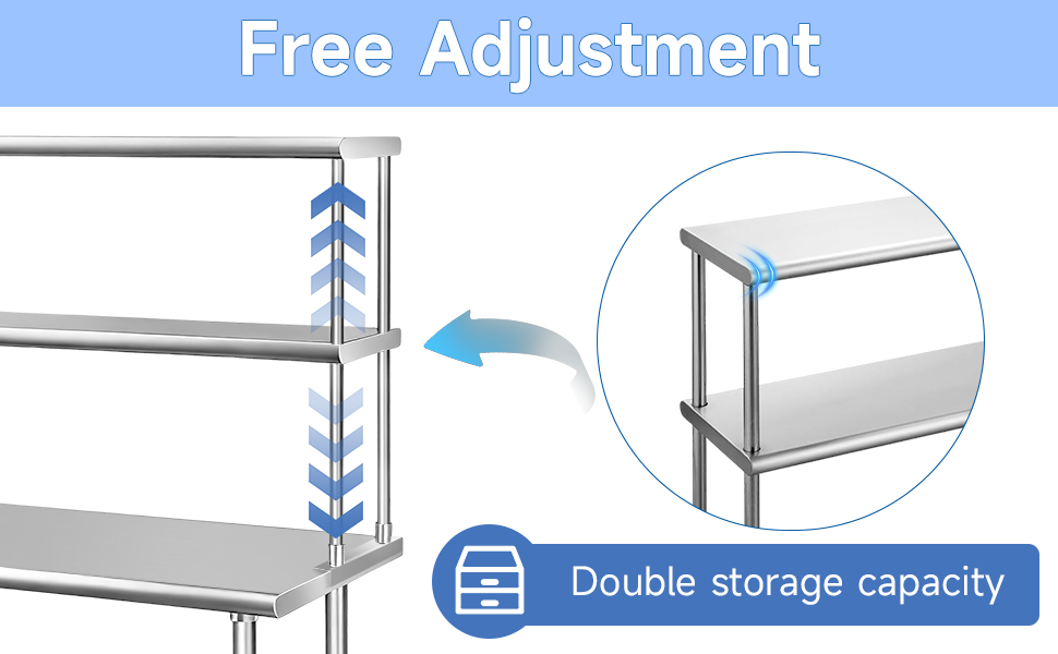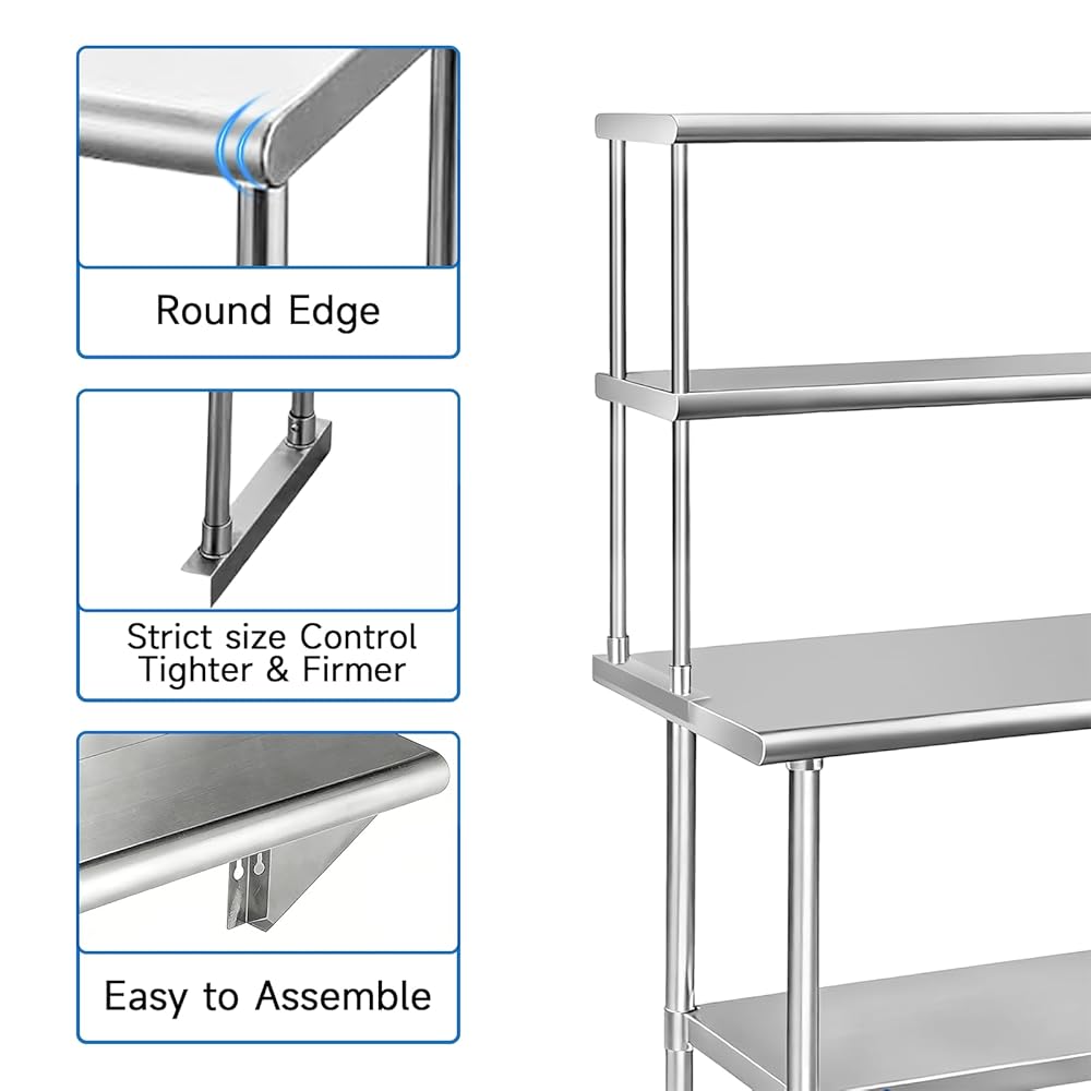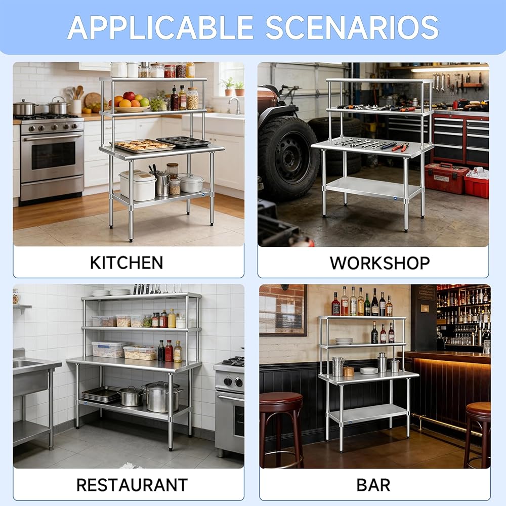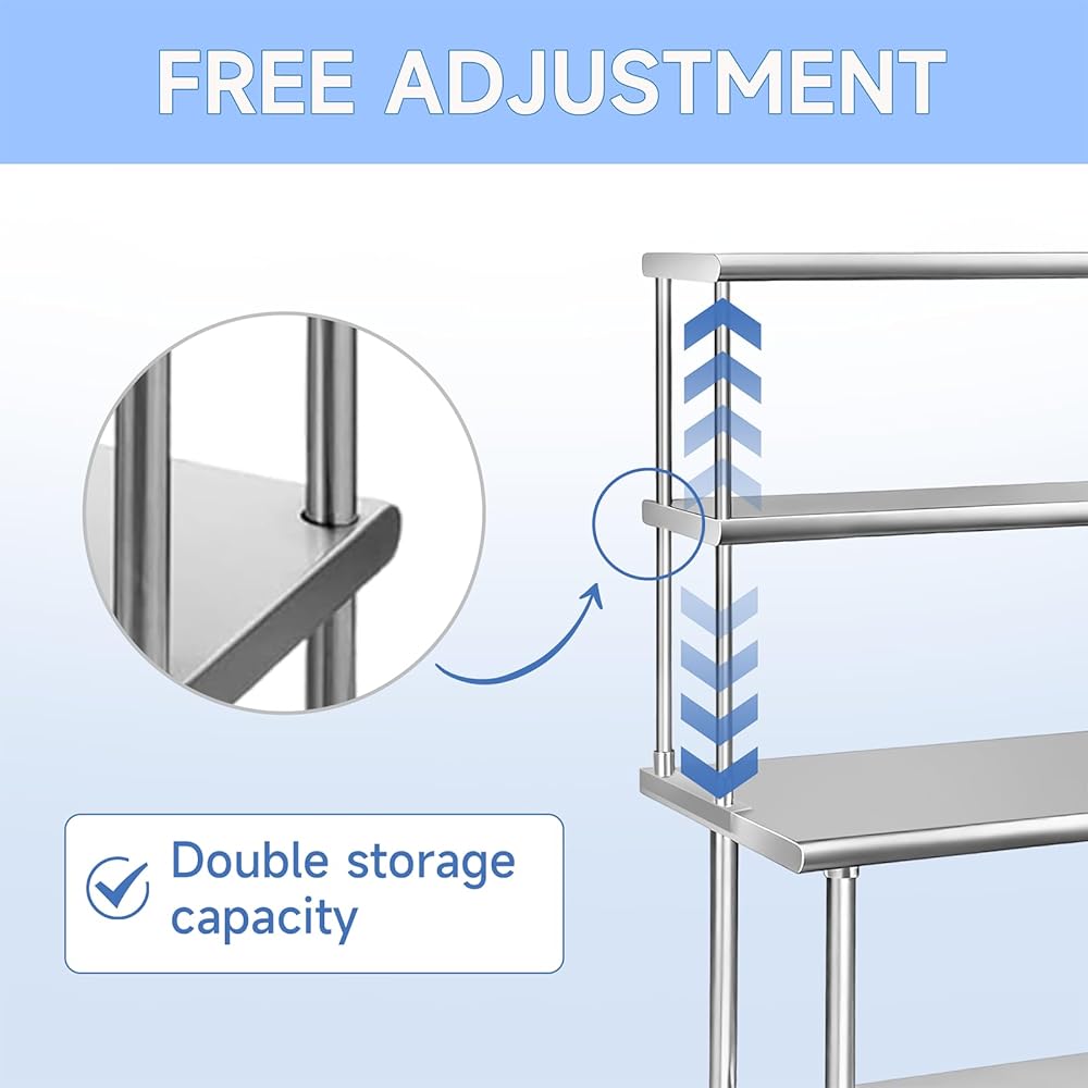 Adjustable Double Overshelf: This table with overshelf comes with an adjustable lower shelf, allowing you to customize its height freely. It serves as a practical stainless steel table with shelves, adding valuable storage space to your kitchen or workspace effortlessly.