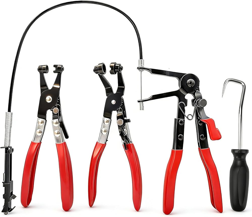 Klfte 4-piece hose clamp removal tool set, hose clamp with long spring, and accessory hook are suitable for automobile coolant radiator heater and water pipe.