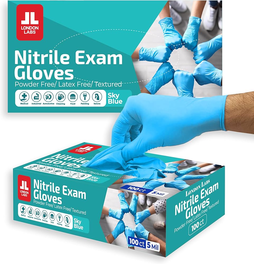 Multiple Colors, Sizes & Bulk Packs Available: Choose from black nitrile gloves, blue nitrile gloves, and other popular options. Available in XS, Small gloves disposable latex free, Medium, Large, XL, and XXL to ensure a perfect fit for every hand. London Labs gloves feature a textured grip to reduce hand fatigue during extended use. Order by the box of 100, 200 gloves or stock up with bulk cases of 1000 gloves, ideal for first aid kit, clinics, warehouses, salons, commercial kitchens, and more.