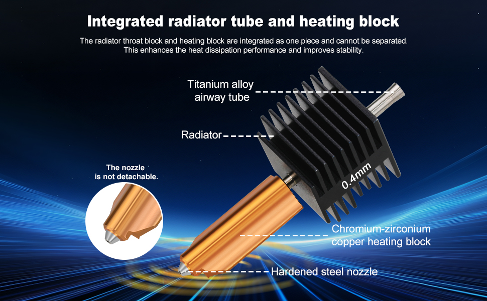 Integrated Dual-Metal Construction: One-piece design eliminates detachable components, boosting heat dissipation and print stability. Say goodbye to clogs and temperature fluctuations—ideal for consistent, high-quality prints.