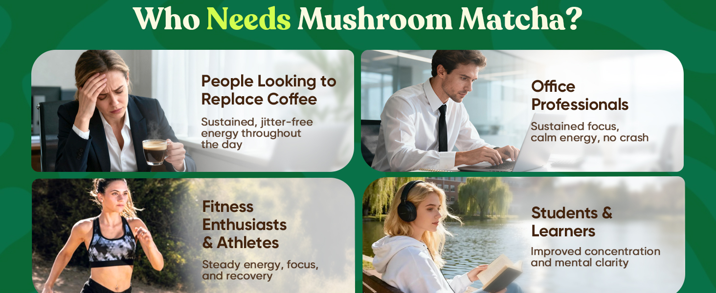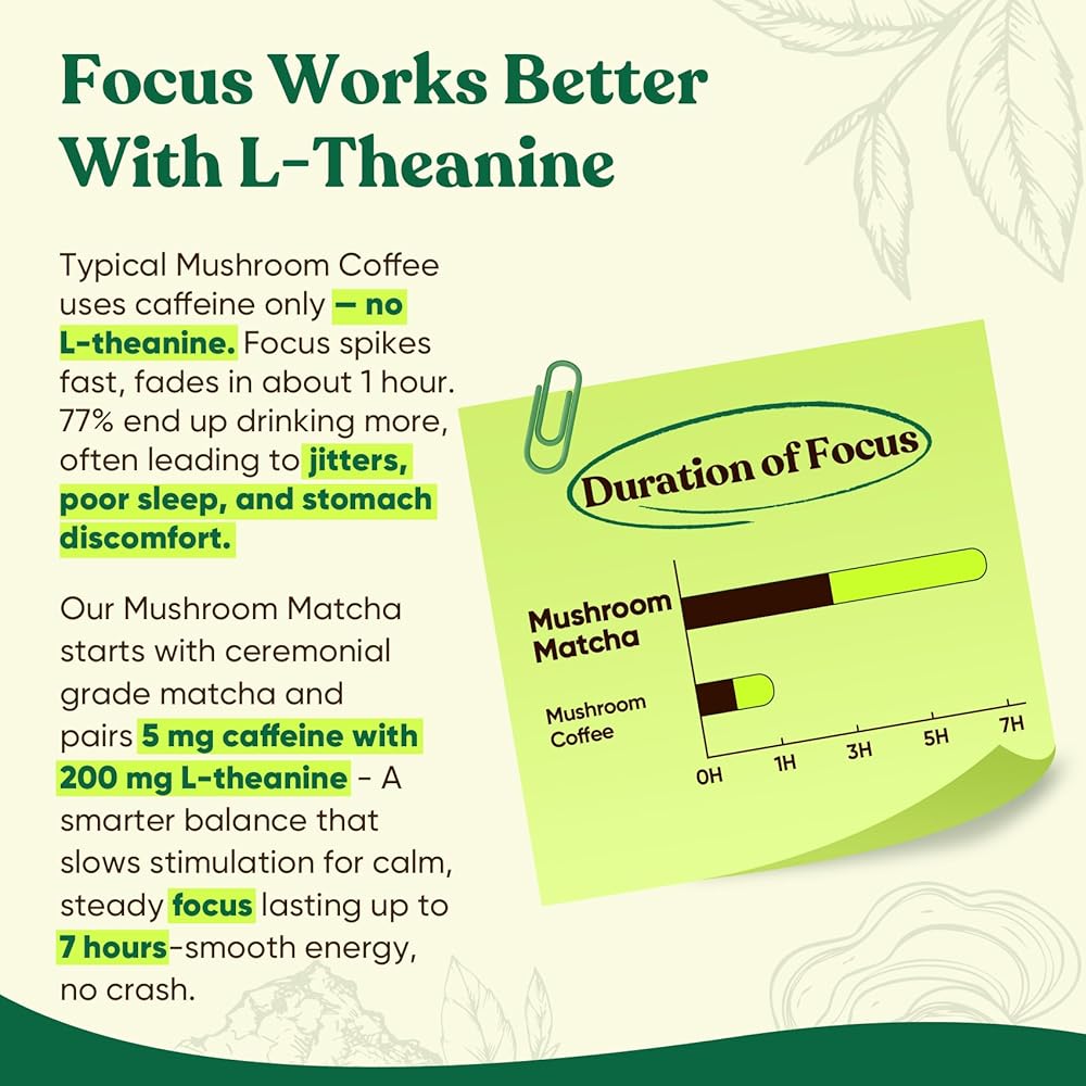 Better than Mushroom Coffee: Ceremonial matcha contains natural caffeine paired with 100% L-theanine—absent in regular mushroom coffee. This combination supports long-lasting focus and steady energy without the spikes and crashes of typical caffeine drinks.