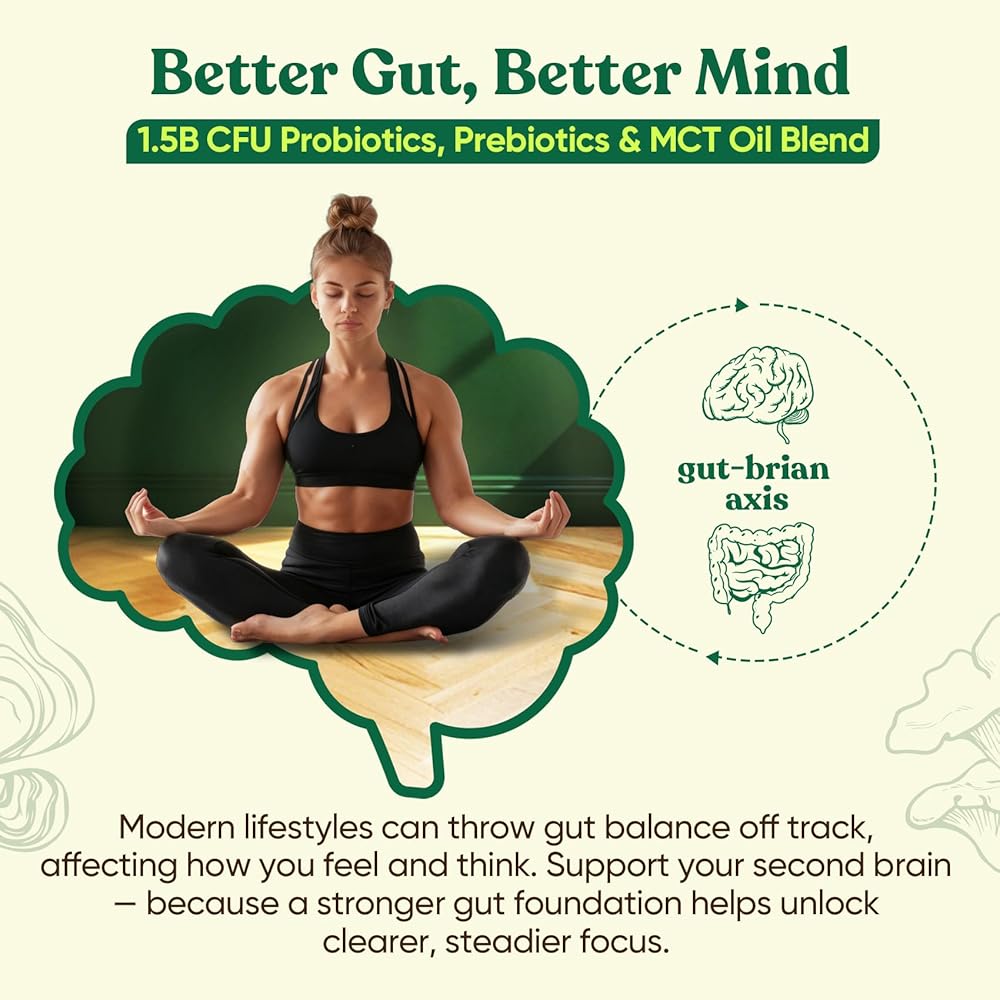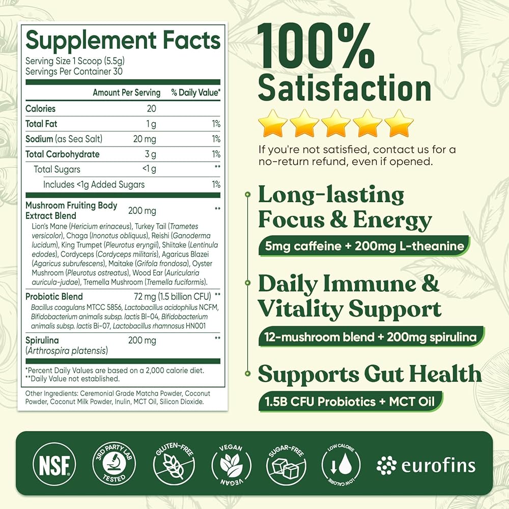 1.5B Probiotics for Digestion : Added probiotics work synergistically with spirulina and mushrooms, helping you enjoy all the benefits of the blend while supporting digestive comfort and maintaining a healthy gut environment.