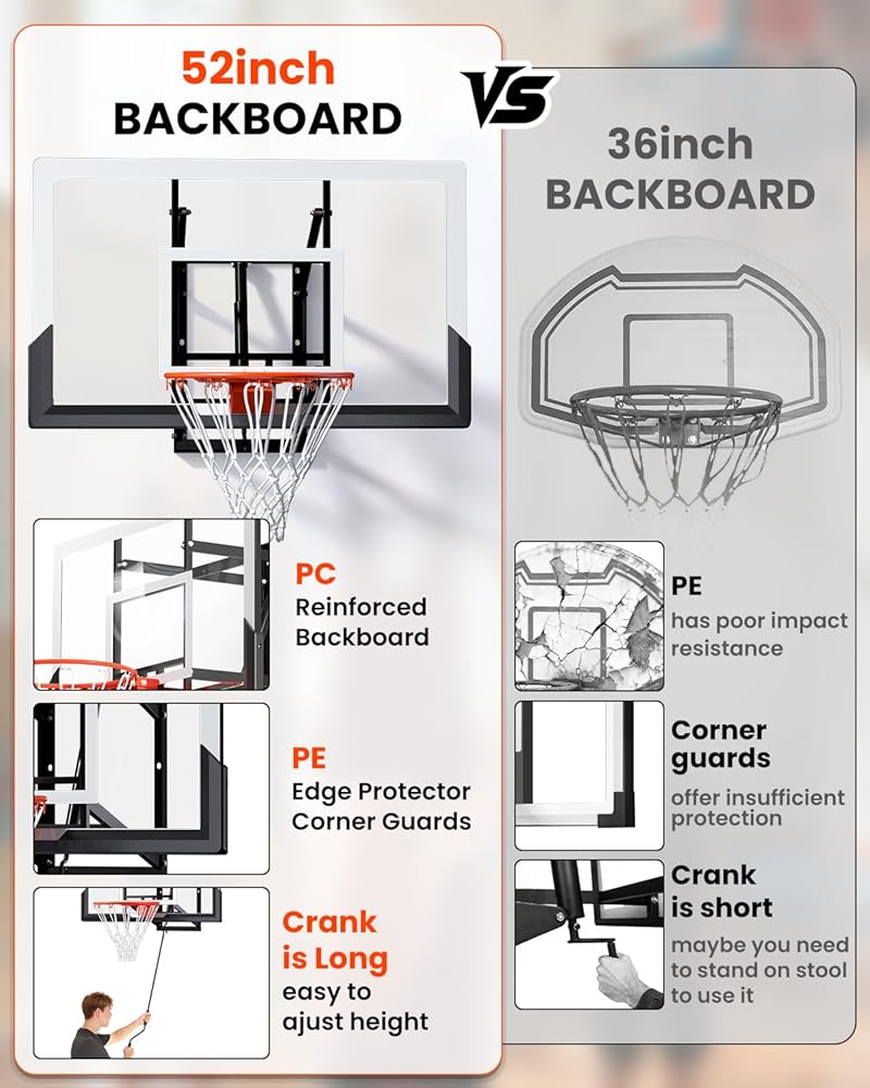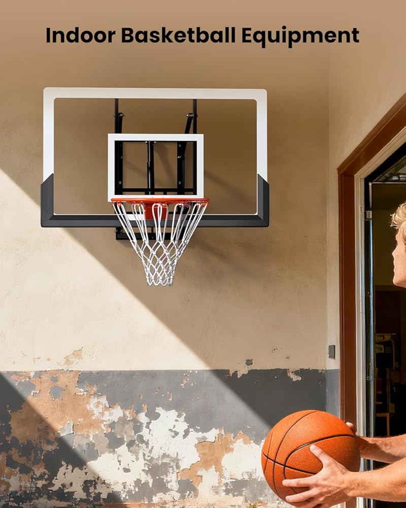 Shatterproof Backboard & Quality Rim: Equipped with a shatterproof 52 inch PC backboard and an 18-inch professional breakaway rim, it provides professional-grade performance whether used as an indoor/outdoor wall-mounted basketball hoop