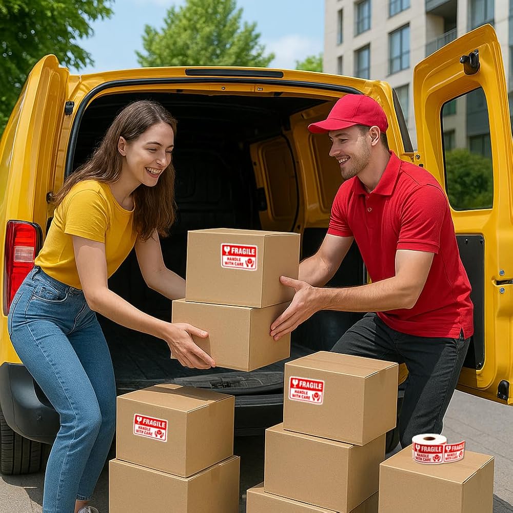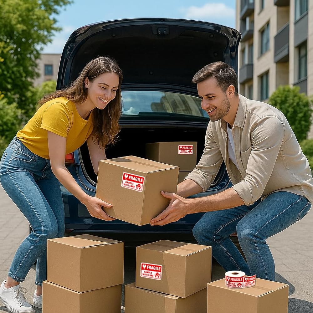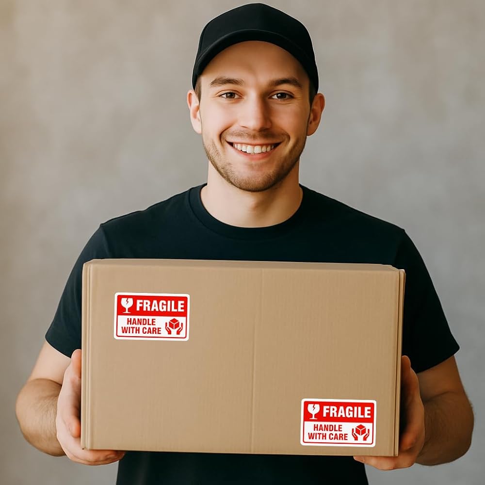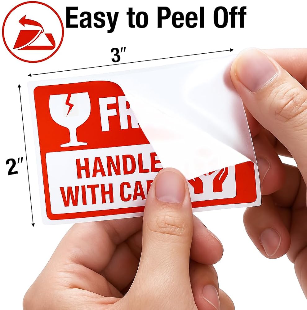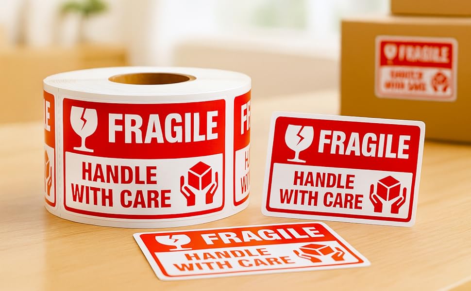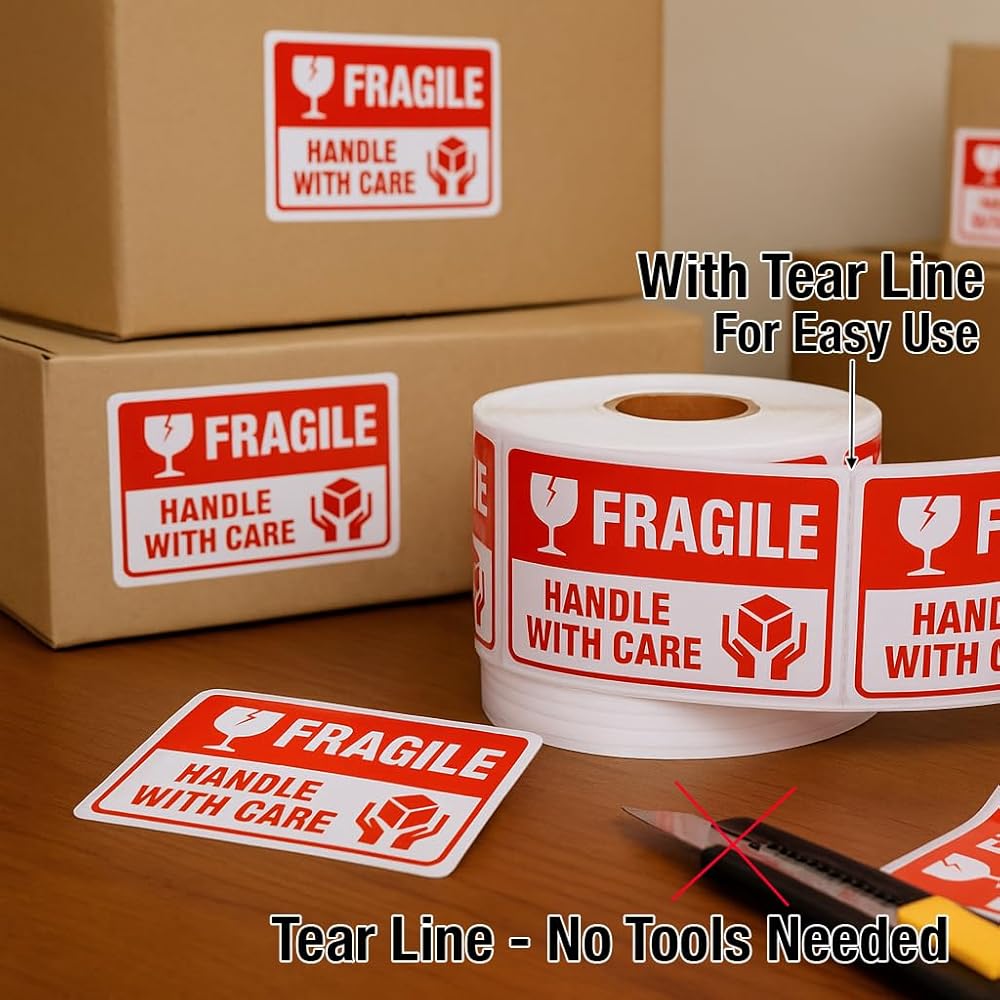 Bright Fragile Stickers Labels — Red “FRAGILE” text with “Handle with Care” instantly grabs attention and helps reduce the risk of damage during transit