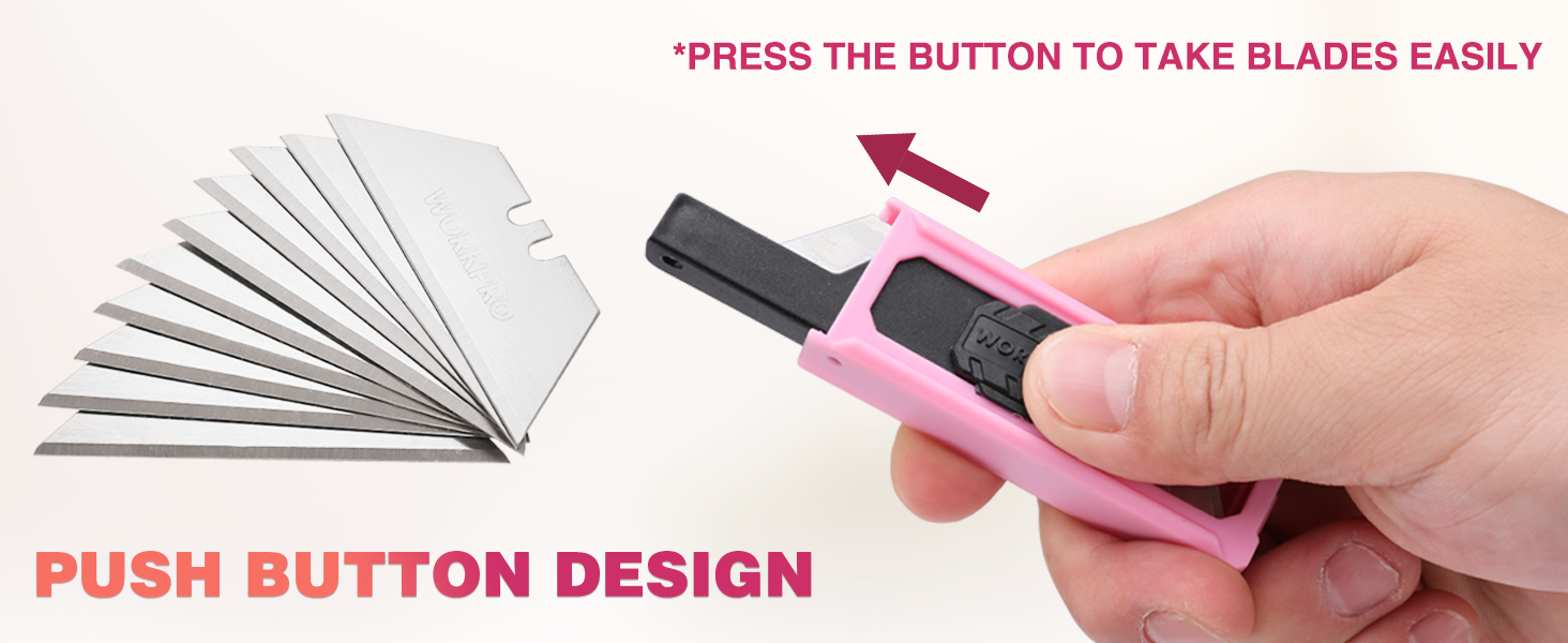 Pink Blade Box: The box contains 10 trapezoidal blades. Push-button design, push out a blade each time until the blade is used up