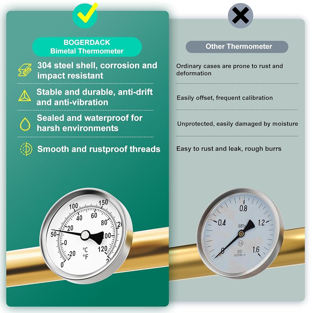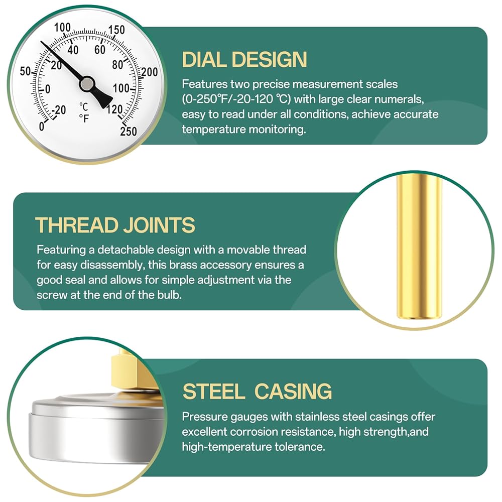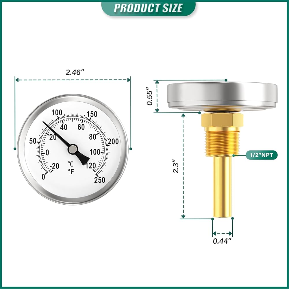 2PCS 0-250°F/-20-120℃, Bimetal Thermometer, 2.5" Dial Size, 1/2" Connection Thread, Lead-Free Brass Stem with Total Length of 2.3" Back Mount, Accuracy 2%, for hot Water, boilers, and Pipes