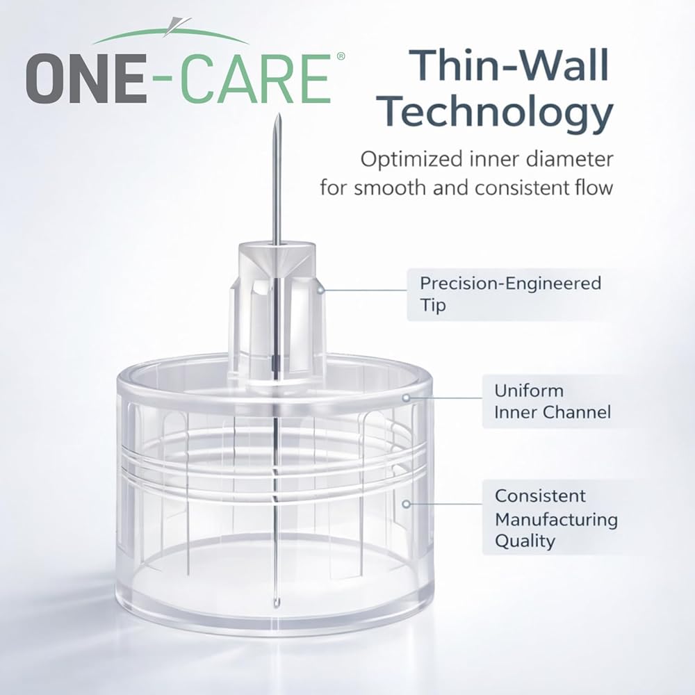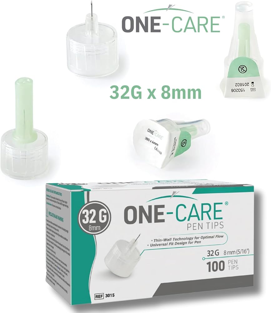ONE-CARE Pen Tips 32G x 8 mm (5/16”) feature a thin-wall channel design with an optimized inner channel structure. The 32 gauge tip is manufactured with a defined length of 8 mm and finished through an electropolishing process with applied lubrication to reduce surface friction. The tips are equipped with a universal twist-on threaded connection compatible with most standard pen-type systems. Each pen tip is individually sealed and supplied in a box containing 100 pieces. Packaging appearance may vary.
