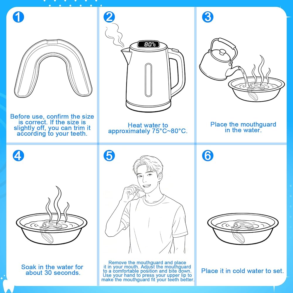 Instructions for use: Our shapeable braces are 2.28*2.28*0.74in size. 1. Confirm the size and trim according to your teeth. 2. Soak the braces in 75-80 degree water for 30 seconds. 3. Remove the braces and place them in your mouth, adjusting for a comfortable position and biting down to ensure a better fit. 4. Then remove the braces and place them in cold water to set
