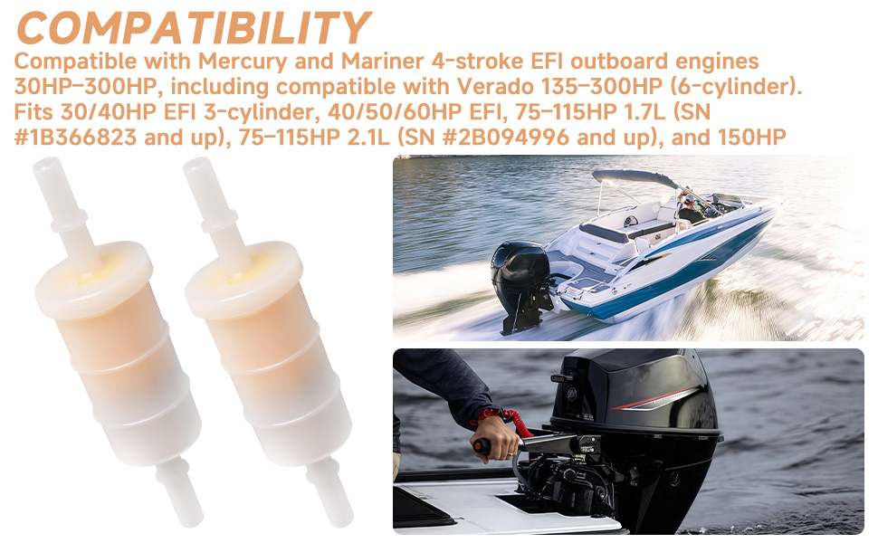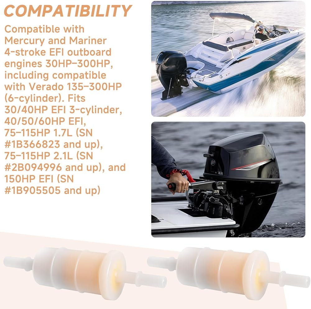 Compatibility:Compatible with Mercury and Mariner 4-stroke EFI outboard engines 30HP–300HP, including compatible with Verado 135–300HP (6-cylinder). Fits 30/40HP EFI 3-cylinder, 40/50/60HP EFI, 75–115HP 1.7L (SN #1B366823 & up), 75–115HP 2.1L (SN #2B094996 & up), and 150HP EFI (SN #1B905505 & up). Not for most 2-stroke models or 3/8" fuel hose