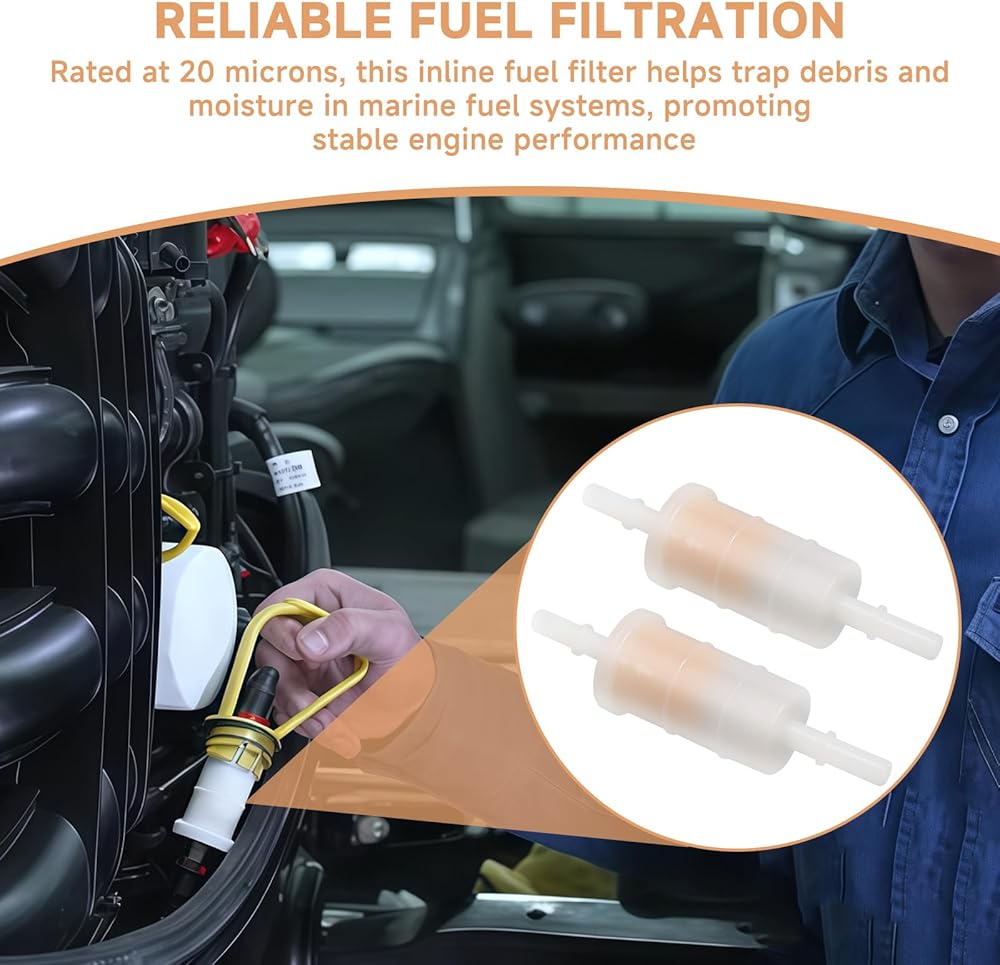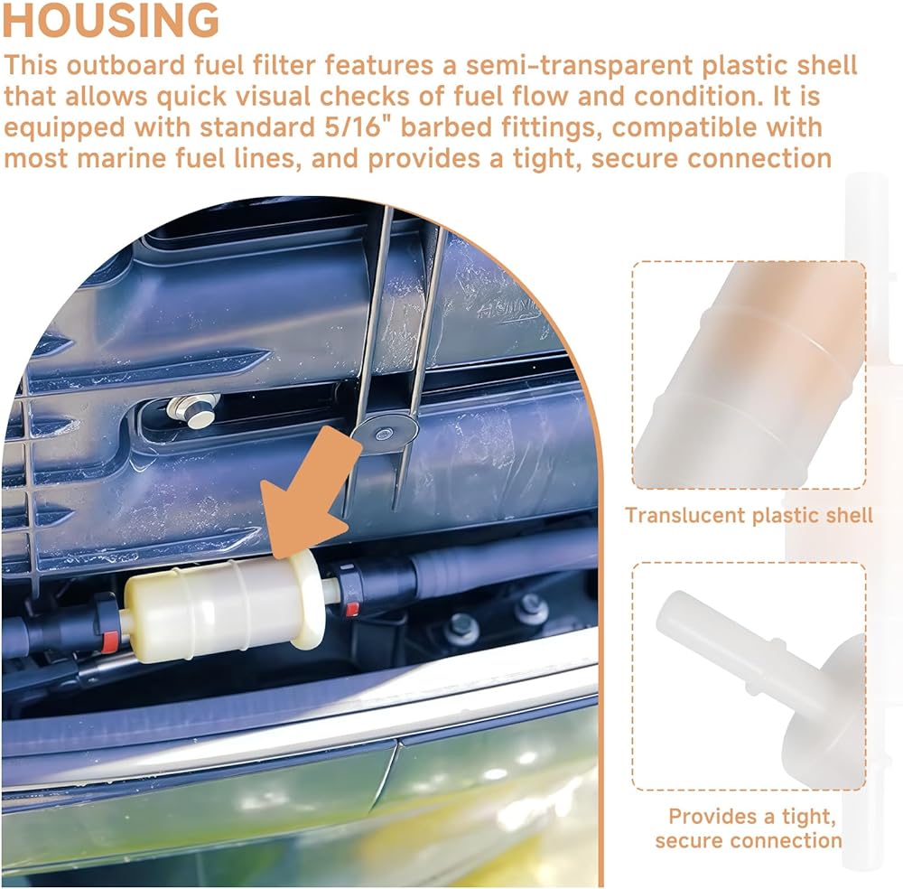 Durable Housing: Semi-transparent plastic housing allows quick visual inspection of fuel condition and debris. Equipped with standard 5/16" barbed fittings for a secure connection using existing hose clamps, compatible with select marine fuel lines. Also compatible with quicksilver outboard inline fuel filter replacements