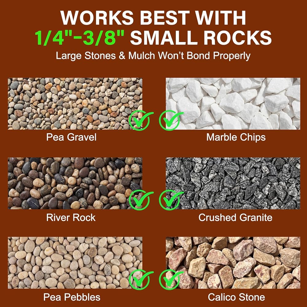 【Designed Specifically for 1/4"–3/8" Small Rocks】Our specialized formula is engineered to create a powerful bond on Pea Gravel, Pea Pebbles, Crushed Granite, and Small River Rocks or Marble Chips. We've rigorously tested this gravel glue for landscaping to ensure it holds tight, so you can use with confidence. Please note: Large stones (over 1/2") & mulch won't bond properly, so stick to the recommended size for the best results.