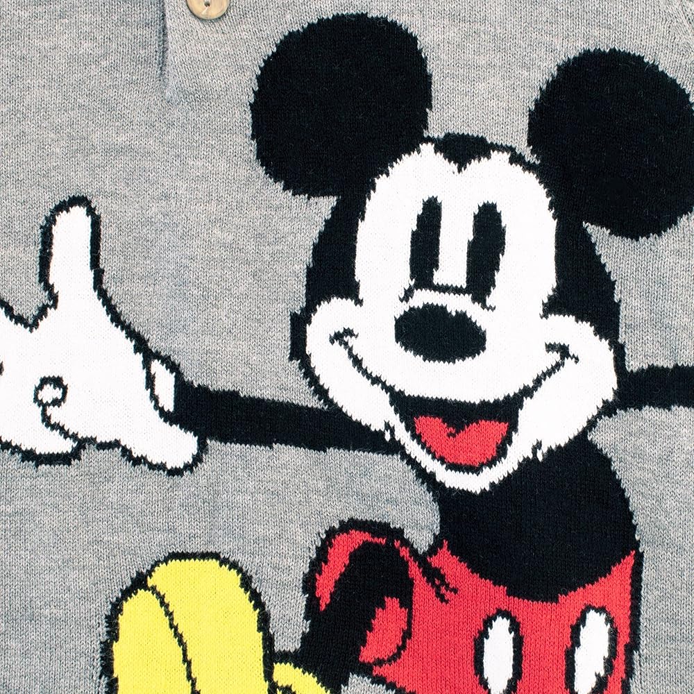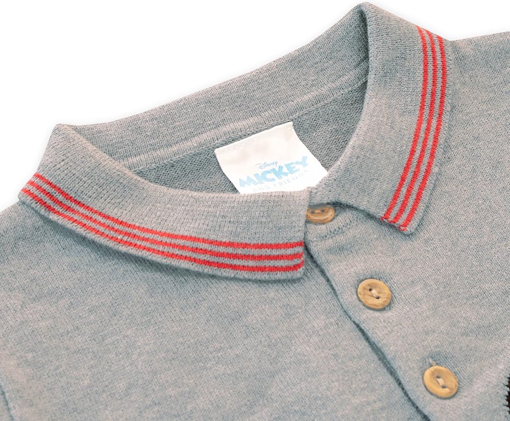 Oh Boy get your mini Mickey Mouse fan all ready for the day in this awesome Disney Mickey Mouse Knit Polo. This all over grey knit top features Mickey Mouse off center in a colorful bold print. Finished off with brown mottle polo buttons, red stripe detail along the collar edge and sleeve and ribbed cuff and hem detailing. Get ready for the colder months in this adorable Mickey Mouse warm knit tee.