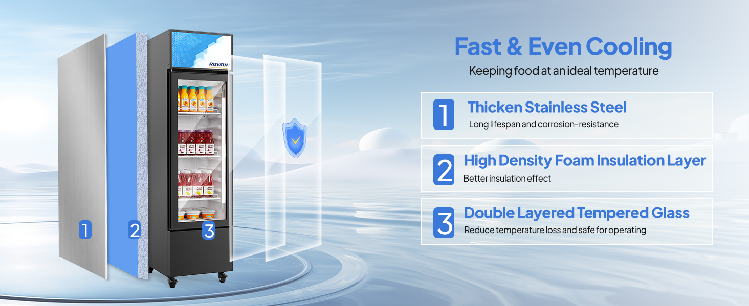 USER FRIENDLY DESIGN - Interior LED lighting for illuminating the commercial refrigerator, making food look inviting. The customizable lightbox meets your preference or promotion needs. The dual-pane tempered glass door ensures long lifespan, strong stability and clear vision, which could close itself to save energy