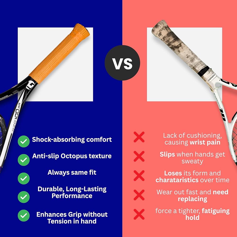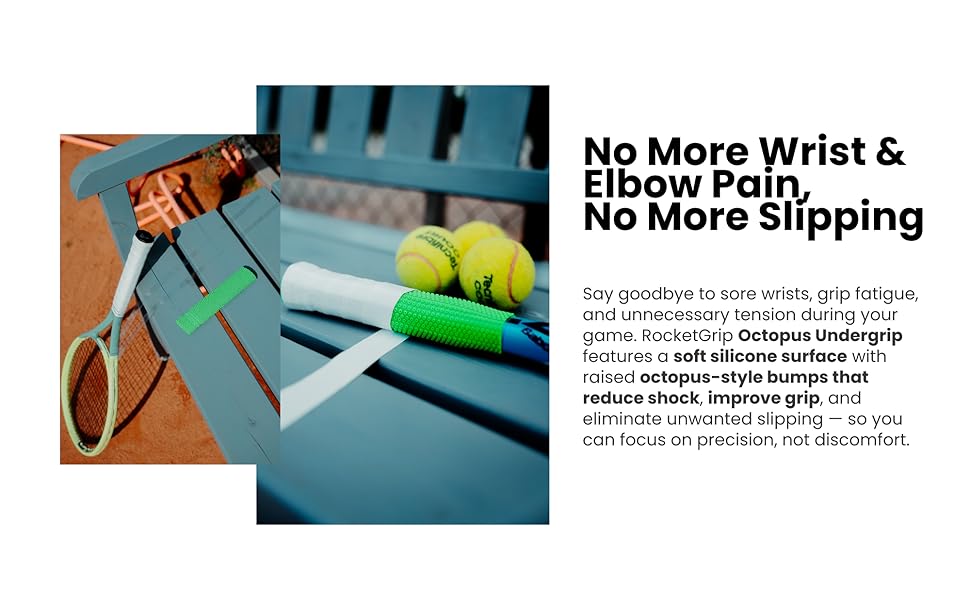 🐙 VIBRATION-REDUCING COMFORT – Experience every shot with less strain. The soft silicone cushioning of the RocketGrip Octopus Tennis Undergrip absorbs shock and reduces wrist fatigue, making it easier to play longer without discomfort — essential for serious tennis players.