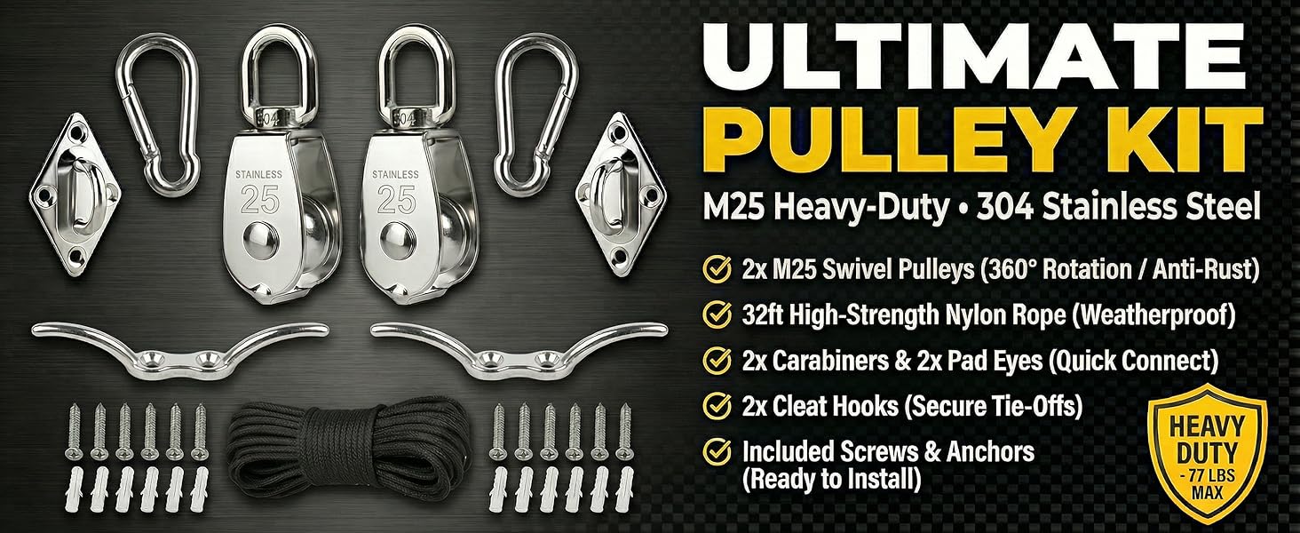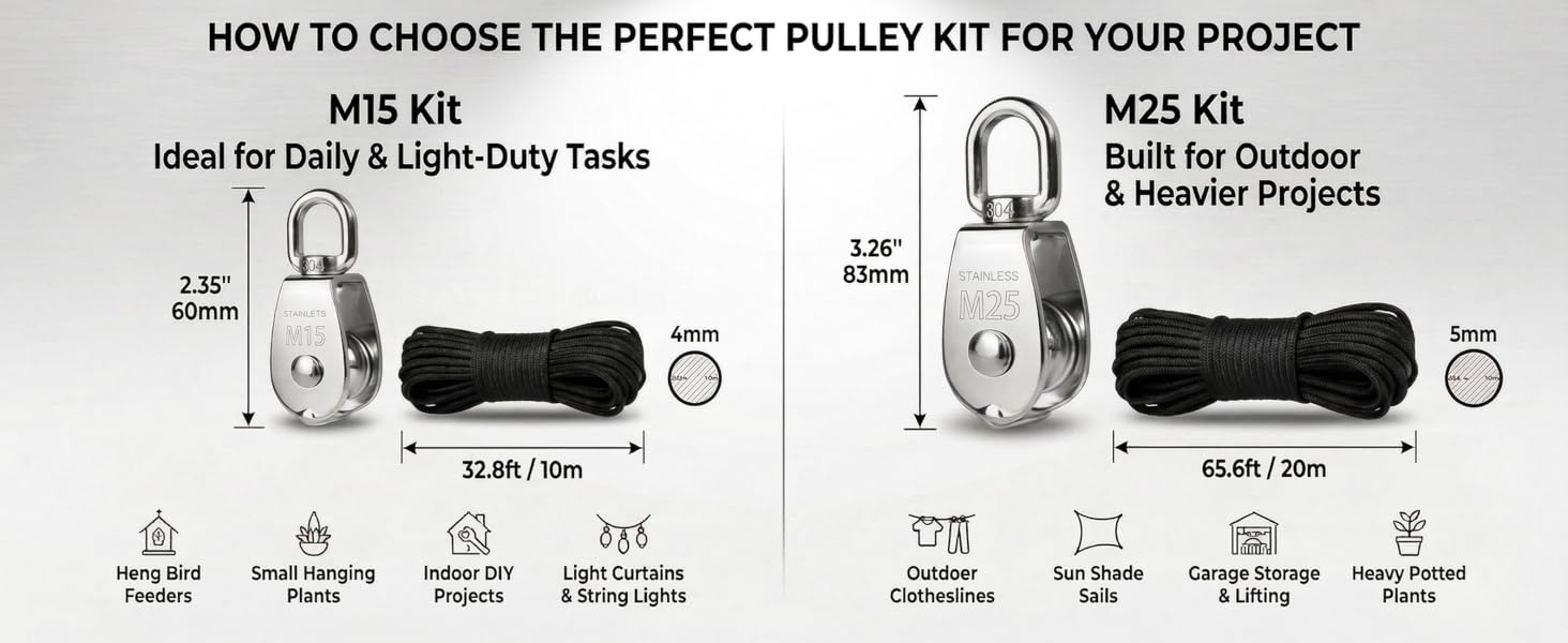【All-in-One Pulley Kit for Versatile Use】:This complete kit includes 2 M15 pulleys, weatherproof rope, hooks, eye pad plate, and rope cleat—everything needed for flag pole pulley kit setup, clothesline pulley installation, garage pulley lift system and all pulley system needs.