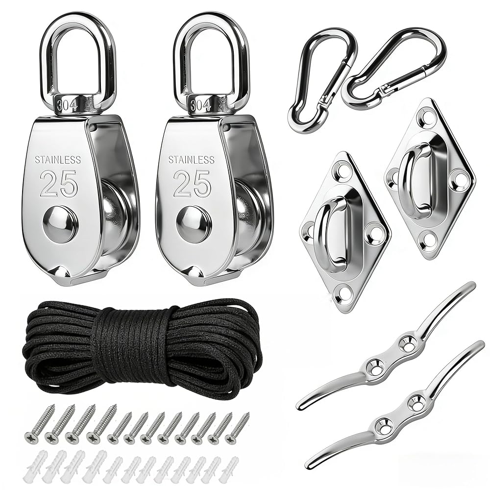 【304 Stainless Steel Rope Pulleys for Durability】:Crafted from premium 304 stainless steel, these pulleys offer superior rust, corrosion, and wear resistance—perfect for both indoor garage hoists and outdoor use like flag pole pulley setups. The heavy-duty construction ensures long-lasting performance, making them reliable pulley block and pulleys for rope in all environments.