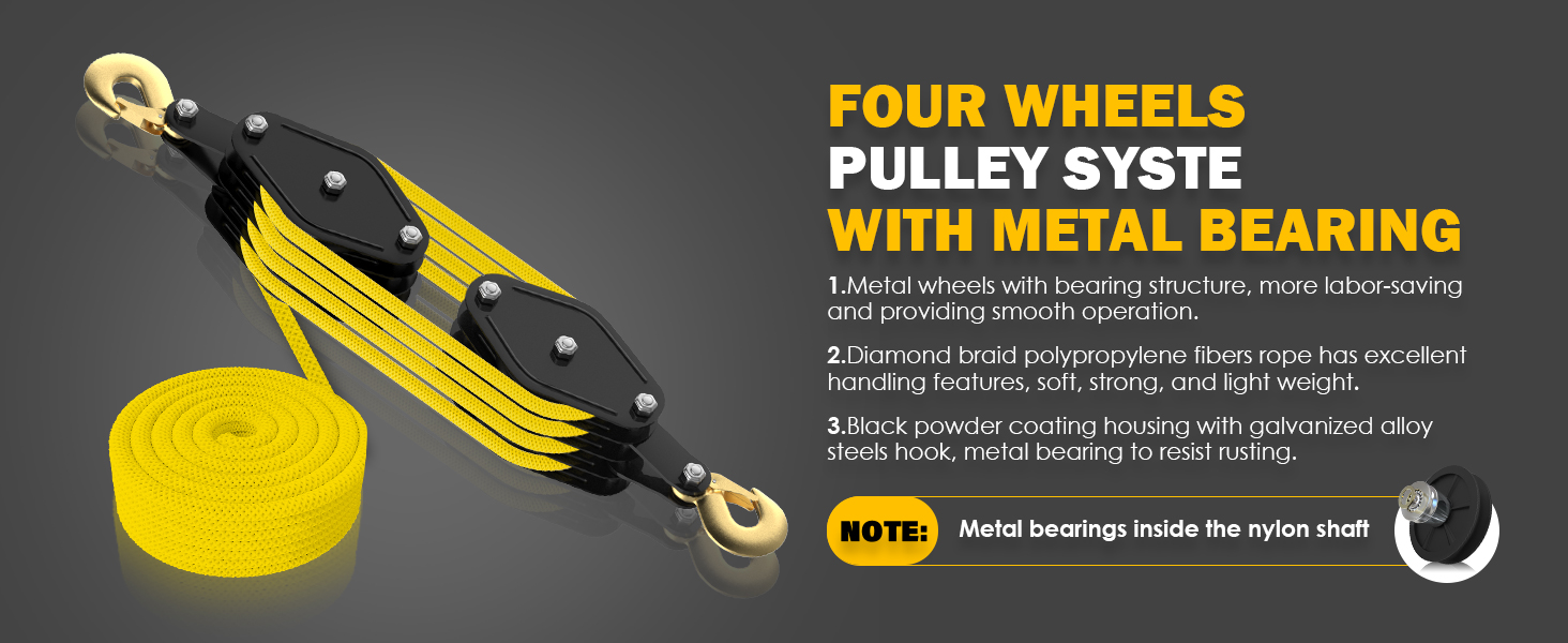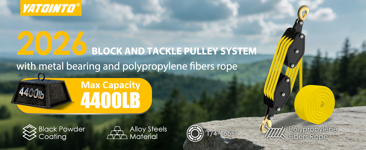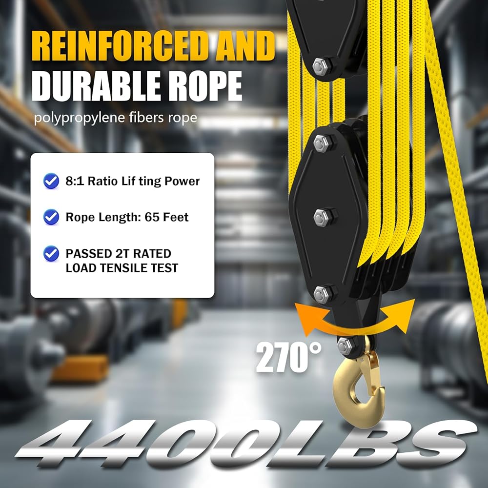 【HEAVY LOAD CAPACITY】: 4400 lbs Breaking Strength and 2200 lbs Load Cap pulley block and tackle system is designed to lift both heavy and light loads safely. You can trust it to handle heavy-duty tasks without worrying about damage from excessive weight
