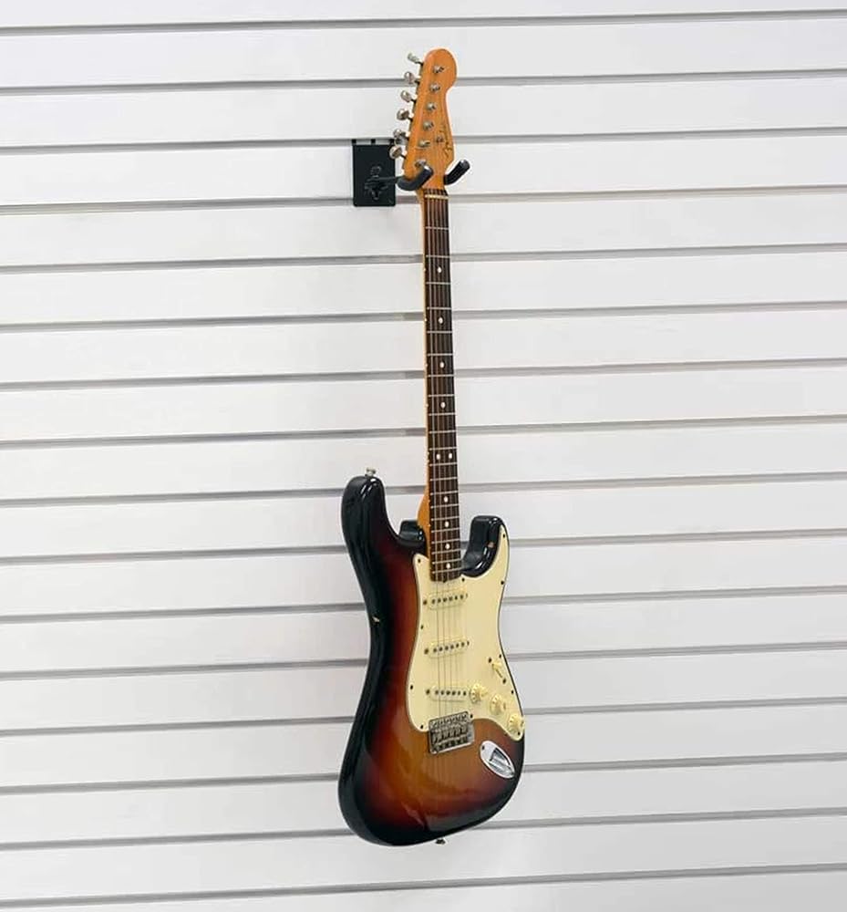 FINISH - Durable mini-tex black powder-coated finish that will withstand the toughest retail environments. Foam padding on ends of arms that hold the guitar.