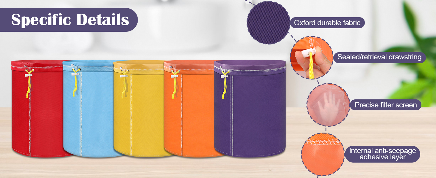 Adjustable Drawstring Closure: The pull-string opening design of the 5-gallon mesh filter bags ensures a secure fit, people just pull the cords to tighten or loosen it however they need. It stays sealed tight during filtering so nothing leaks out, giving you worry-free use.