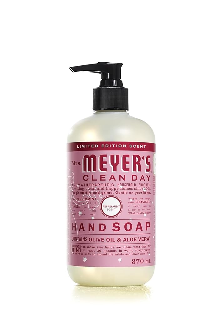 Mrs. Meyer's Clean Day hand soaps are specifically made to clean and freshen hands without over drying, while also providing a special, singular scent for your home. Peppermint scented soap with a hint of vanilla smells perfectly heartwarming. Imagine the sweet pleasure of a candy cane in a cup of hot cocoa. What could be nicer? This hardworking hand soap formula contains olive oil, aloe vera, and essential oils, and thoughtfully chosen ingredients that clean and freshen hands. Made without parabens, phthalates or animal-derived ingredients and always a cruelty-free formula soap. Also available in other garden-inspired scents and products such as Dish Soap and Multi-Surface Cleaner. Mrs. Meyer's – Rooted in Goodness.
