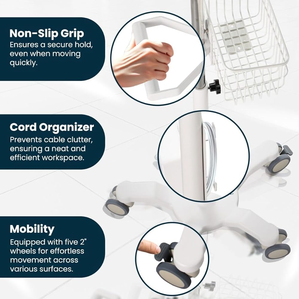 ERGONOMIC: A wire basket on the cart offers invaluable storage space, the integrated cord organizer prevents tangling, and the 2 lockable wheels provide optimal stability.