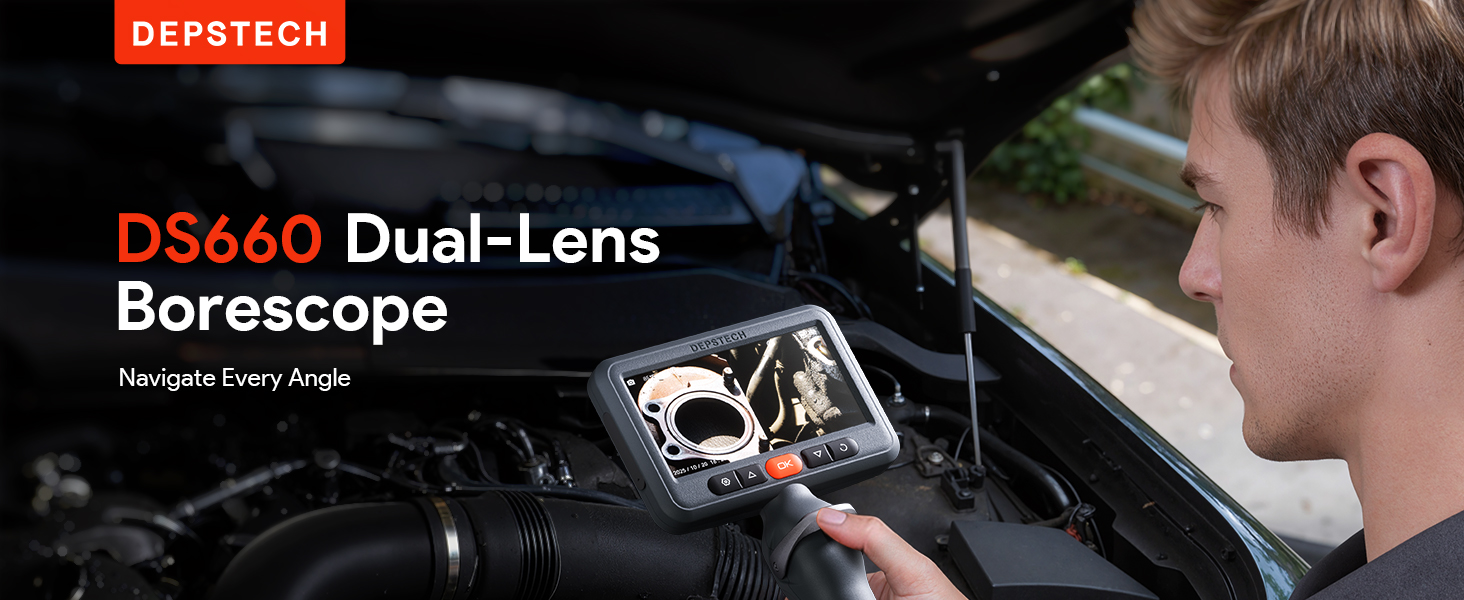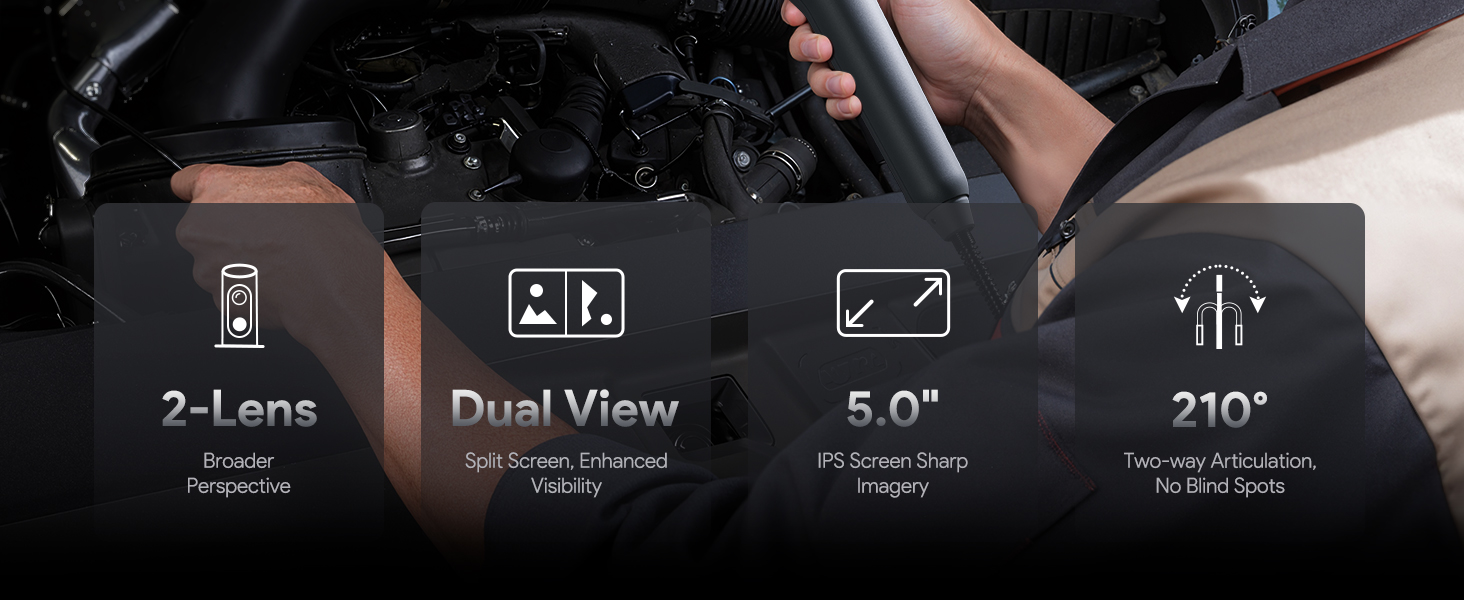 5" IPS Super HD Screen: With dual lenses and split-screen viewing, the DEPSTECH borescope inspection camera simultaneously displays both front and side feeds on its large display. Experience sharp 1080P clarity to reveal every detail in vivid definition—ideal for automotive or plumbing tasks, all without an app