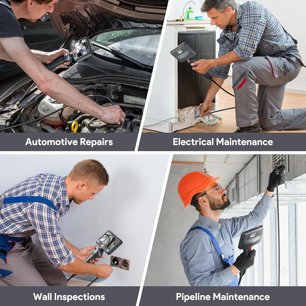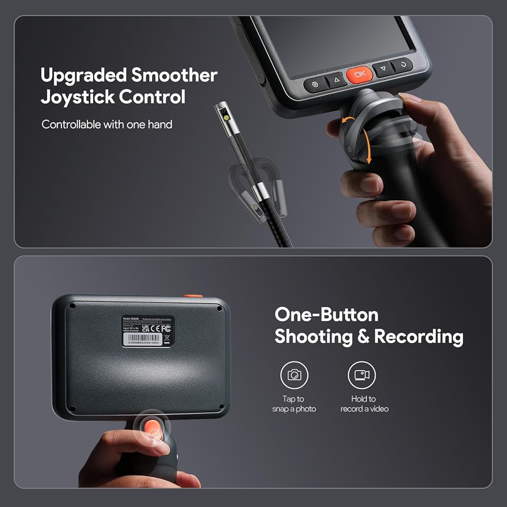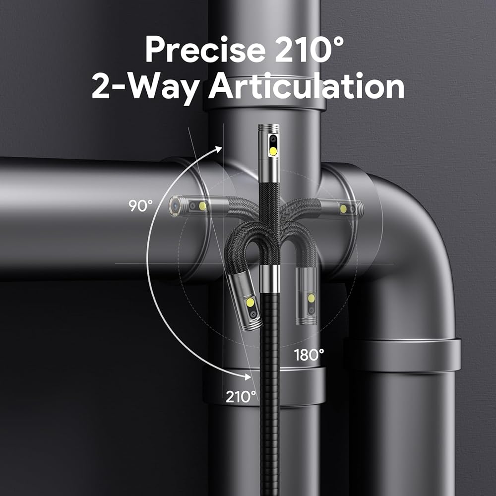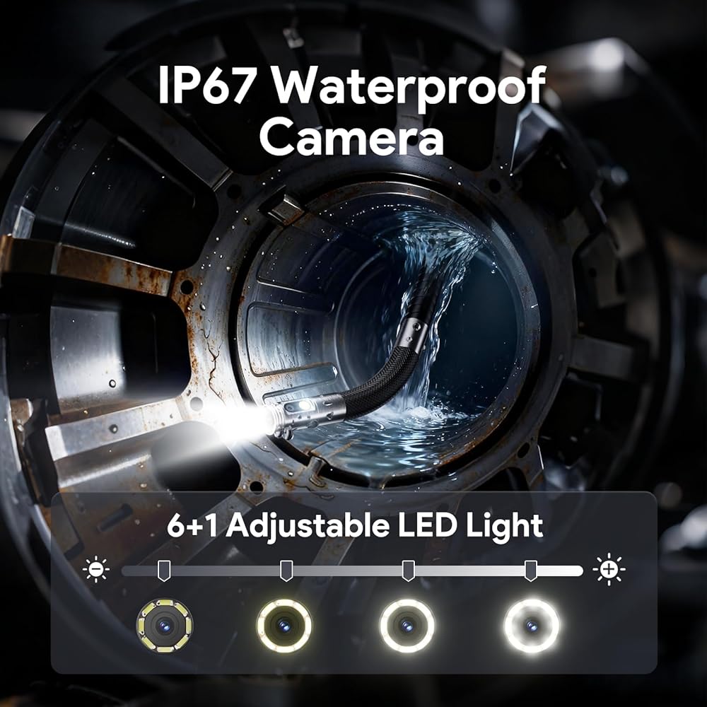 Brilliant in Darkness, Ready for Immersion: This articulating borescope camera with light features 6+1 adjustable LEDs that brighten the darkest spaces. The fully waterproof articulating probe withstands challenging wet conditions while delivering clear visibility for plumbing, mechanical, and industrial inspections
