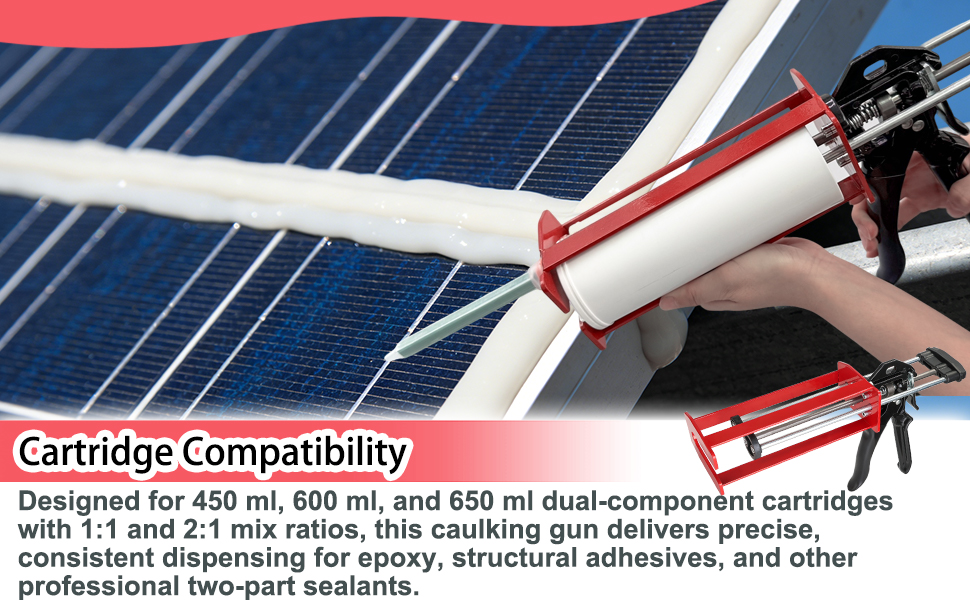 Compatible Ratios – Designed for 450 ml / 600 ml / 650 ml dual cartridges, this glue gun works with both 1:1 and 2:1 mixing ratios, providing flexible use for different adhesive types.