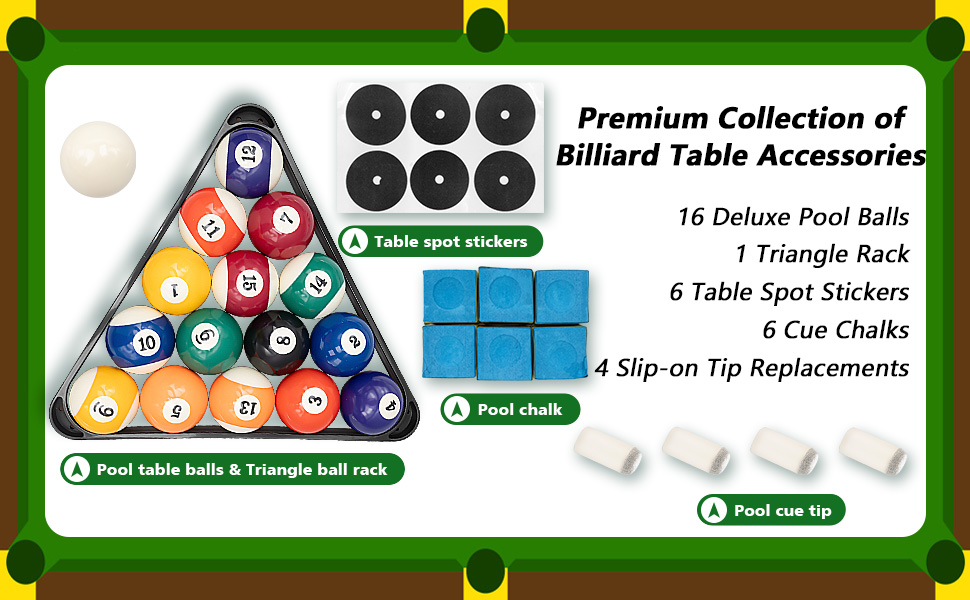 COMPLETE PREMIUM BILLIARD ACCESSORY KIT: This Pool Balls Billiard Set with Triangle includes 16 Balls including a Cue Ball, ABS Plastic Triangle Rack, bonus 6 cue chalk cubes & 6 table spot stickers & 4 Slip-on Tip Replacements. This Billiard Ball set with Rack is Perfect for your Bars, home pool table, community center, man cave or billiards Halls.