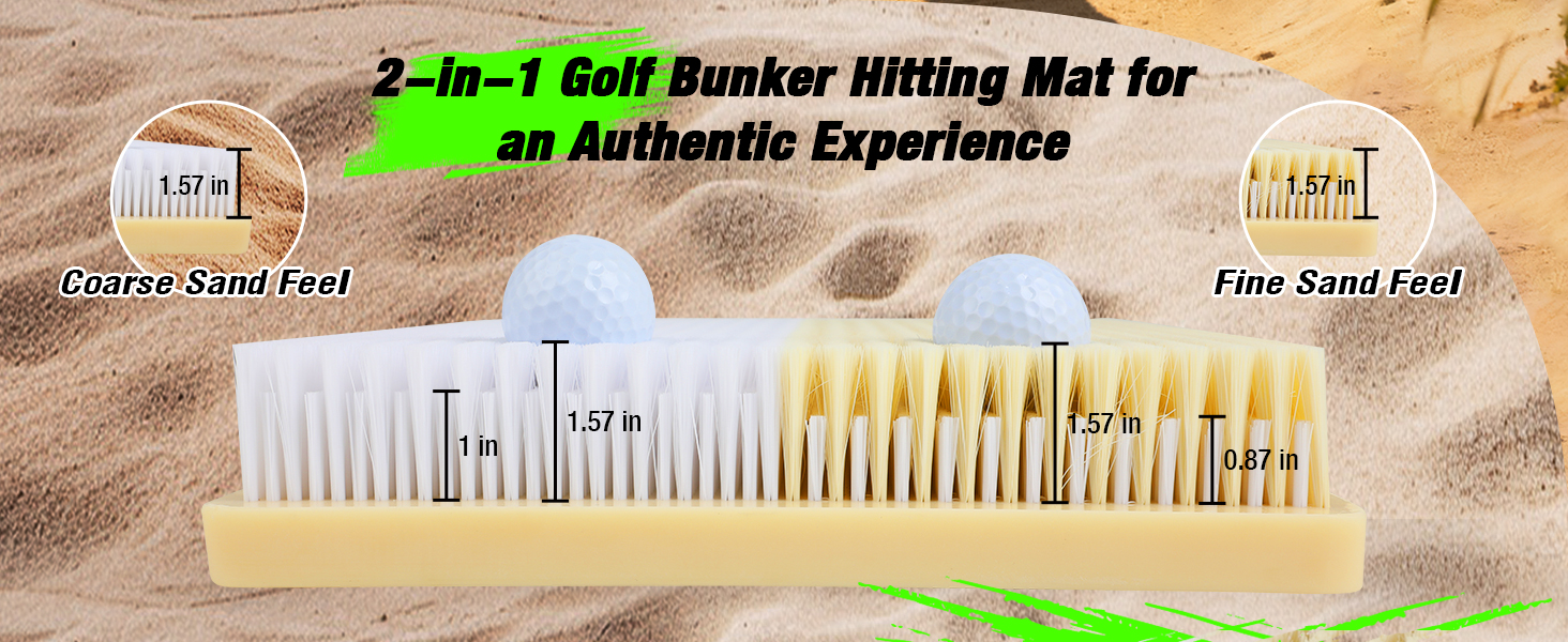 Realistic Golf Bunker Mat - Experience authentic practice with nylon bristles in light yellow and white. These zones realistically mimic fine and coarse sand, training your golf game and bunker shot techniques for any bunker condition you may encounter on the course.
