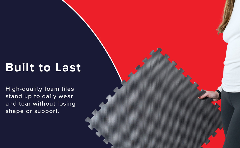 We Sell Mats Multipurpose Foam Tiles provide a cost-effective solution for extra padding needed throughout your home. Our interlocking EVA foam floor mats fit seamlessly in home gyms and workout areas, kid playrooms, daycare and classroom flooring, office flooring and mud and laundry rooms. It can also be used for extra padding when standing by the kitchen sink, working in a salon, support for older dogs or cats or use beneath tents and sleeping bags while outdoor camping. We Sell Mats floor tiles are lead-free, latex-free and phthalate-free, providing a non-toxic floor padding solution for added cushion and peace of mind in playrooms for infants, toddlers and kids of all ages. Each tile comes with 2 border pieces—a straight edge and a corner edge. Depending on the size of the surface, the borders can be easily removed and attached to other mats of the same style. There will be enough borders to accommodate a standard rectangular assembly (For example: 6 tiles in a 2x3 assembly, 12 tiles in a 3x4 assembly). Note: If you're building a long walkway or runway that is one tile wide, you will likely run out of straight border pieces. Since the borders are packaged with the tiles themselves the only way to get additional border pieces is to order more tiles. Our Recommendations: We Sell Mats Multipurpose foam tiles are intended for indoor use only and not recommended for use over carpet. Although the flooring will not retain shoe imprints, high heels will leave permanent punctures. While these are intended for light bodyweight workouts at home, it's not designed to serve as padding for heavy equipment in professional grade gyms. If using for vigorous exercise, use floor tape to ensure secure placement. Color shades may vary slightly between each tile.