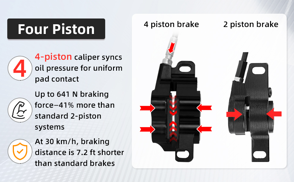 【Powerful 4-Piston Hydraulic Braking】The 4-piston hydraulic system delivers 47% more braking force than standard 2-piston brakes, providing stronger, more balanced stopping power. At 30 km/h, braking distance is reduced by up to 7.5 ft, allowing confident one- or two-finger braking