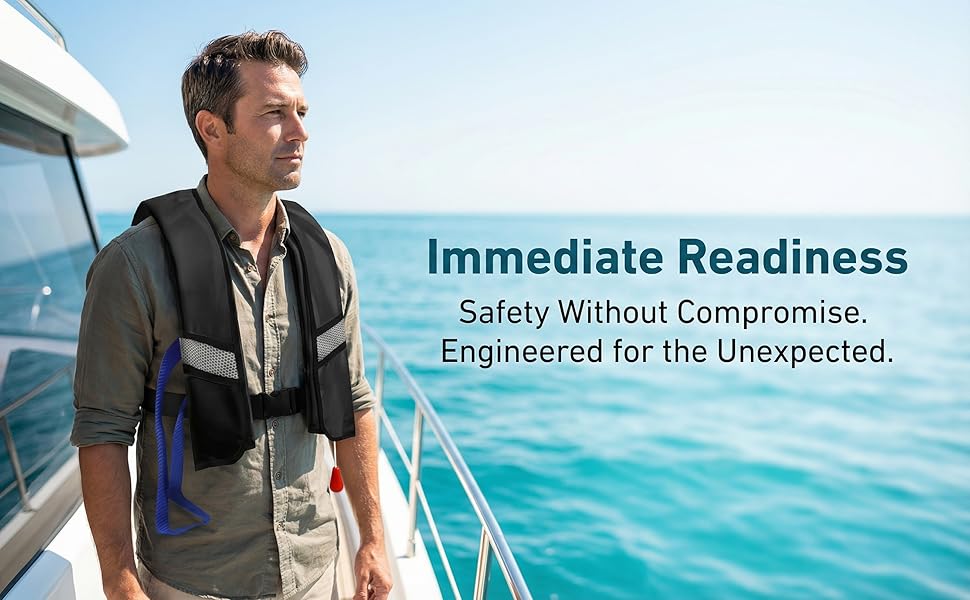 【5 Seconds Inflation 】When immersed in water, Alternatively, manually pull the 'Ruck to inflate' rope(Premium CO2 Cartridge Refill Kit needs to be purchased separately, not included).Equipped with a back-up oral inflation tube on the left of the life jacket, which provides additional safety and reassurance.