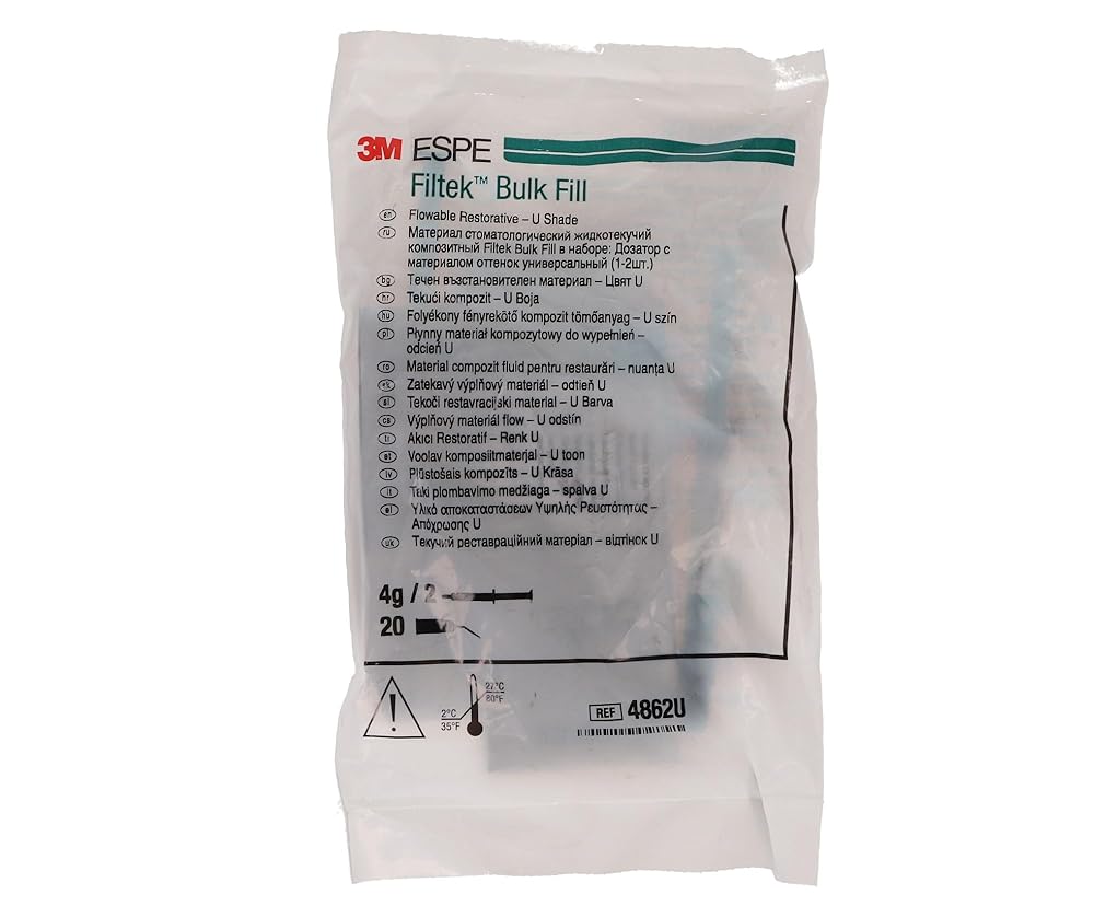 Filtek Bulk Fill Flowable Restorative Refill Shade Universal Syringes, 2 - 2g Syringes. Filtek Bulk Fill Flowable Restorative offers a single-step placement with a 4 mm curing depth and minimal shrinkage stress. Due to its flowable viscosity, the microhybrid material offers an impressive adaptation to the surrounding tooth structure. The zirconia and silica components produce a superior bond as the dental material polymerizes via light-curing into a durable restoration with maximum wear resistance. Filtek Bulk Fill Flowable Restorative is best utilized in Class III and V restorative procedures and as a liner for Class I and II.